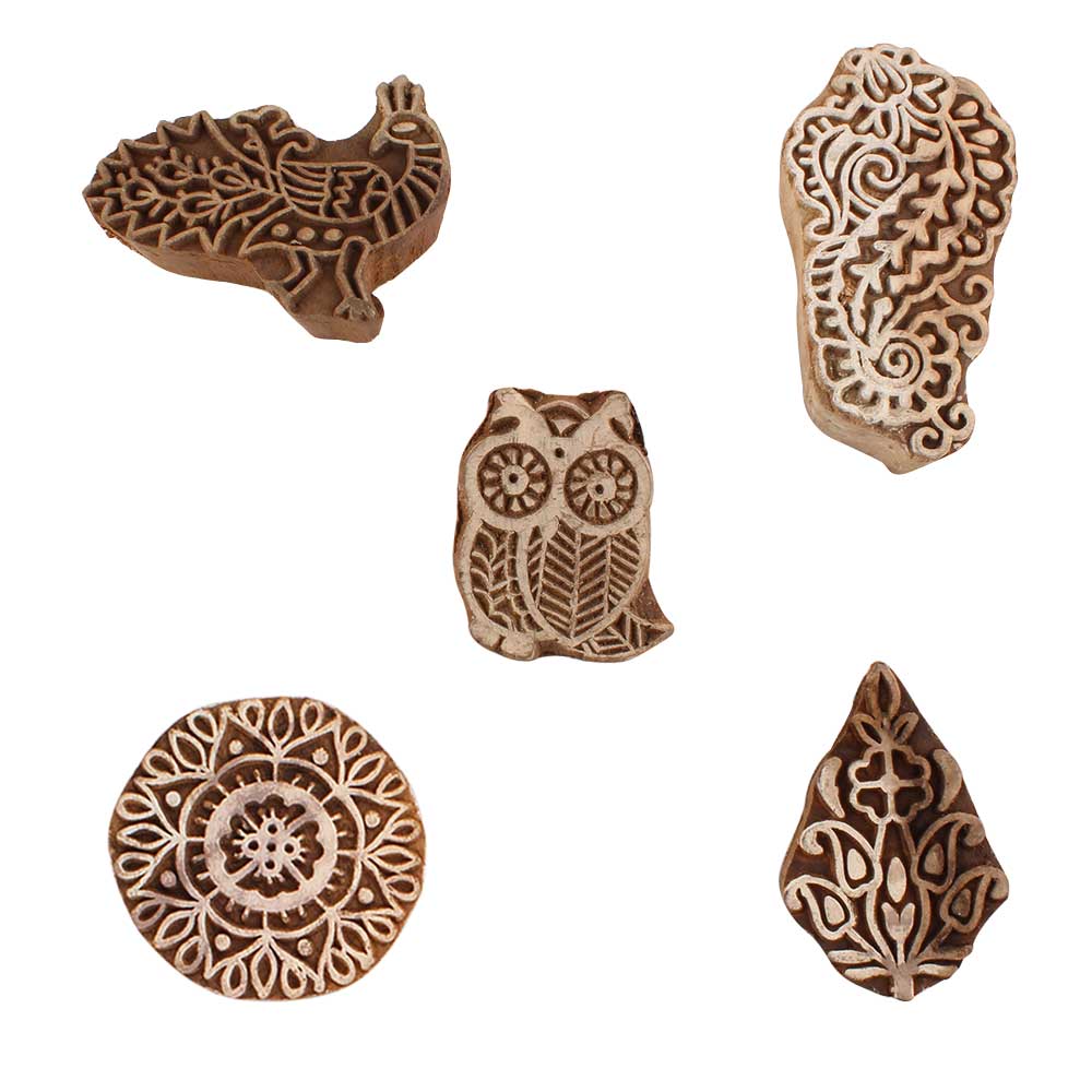 Set of 5 Piece New Mix Wooden Printing Blocks. Ideal for use on Fabric, Paper, Canvas, etc. These Blocks can be use to Print with Oil Colors, Fabric Colors, Water Colors, Acrylic Colors and Vegetable Colors.