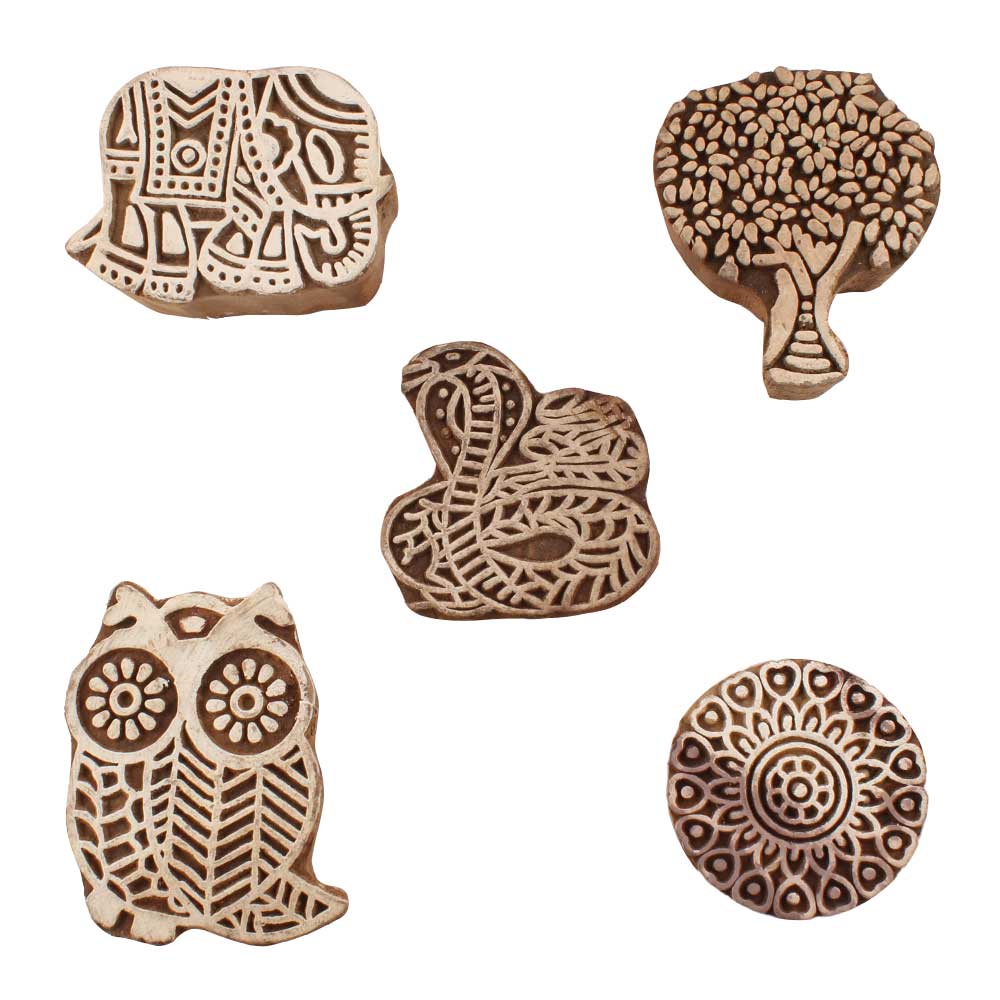 Set of 5 Piece New Mix Wooden Printing Blocks. Ideal for use on Fabric, Paper, Canvas, etc. These Blocks can be use to Print with Oil Colors, Fabric Colors, Water Colors, Acrylic Colors and Vegetable Colors.