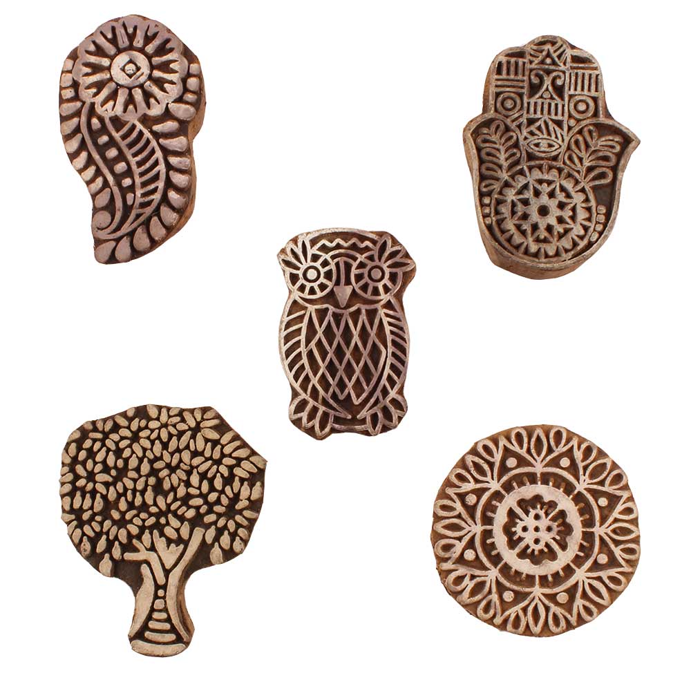 Set of 5 Piece New Mix Wooden Printing Blocks. Ideal for use on Fabric, Paper, Canvas, etc. These Blocks can be use to Print with Oil Colors, Fabric Colors, Water Colors, Acrylic Colors and Vegetable Colors.