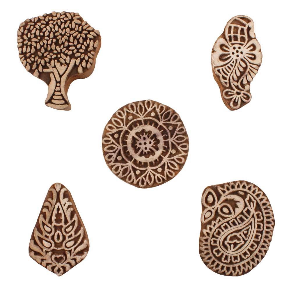 Set of 5 Piece New Mix Wooden Printing Blocks. Ideal for use on Fabric, Paper, Canvas, etc. These Blocks can be use to Print with Oil Colors, Fabric Colors, Water Colors, Acrylic Colors and Vegetable Colors.
