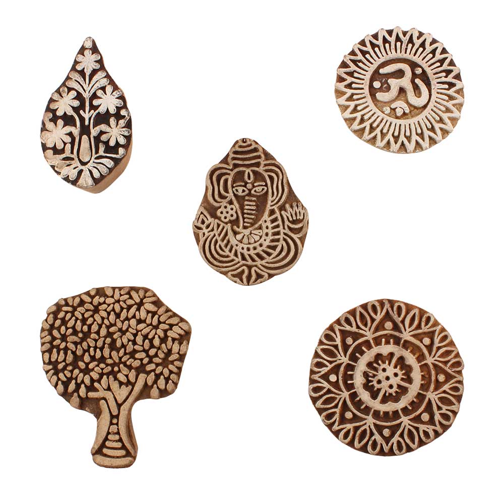 Set of 5 Piece New Mix Wooden Printing Blocks. Ideal for use on Fabric, Paper, Canvas, etc. These Blocks can be use to Print with Oil Colors, Fabric Colors, Water Colors, Acrylic Colors and Vegetable Colors.