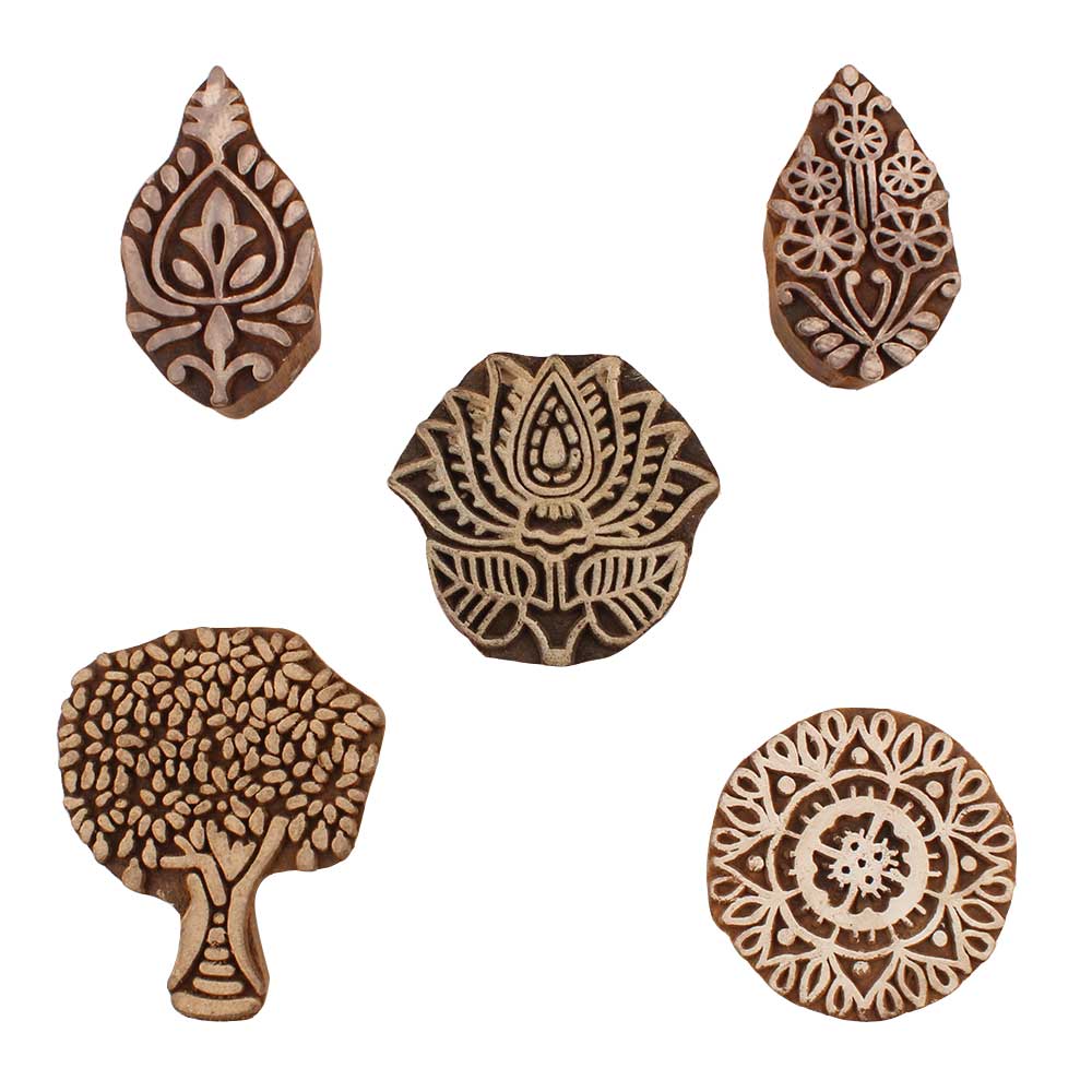 Set of 5 Piece New Mix Wooden Printing Blocks. Ideal for use on Fabric, Paper, Canvas, etc. These Blocks can be use to Print with Oil Colors, Fabric Colors, Water Colors, Acrylic Colors and Vegetable Colors.