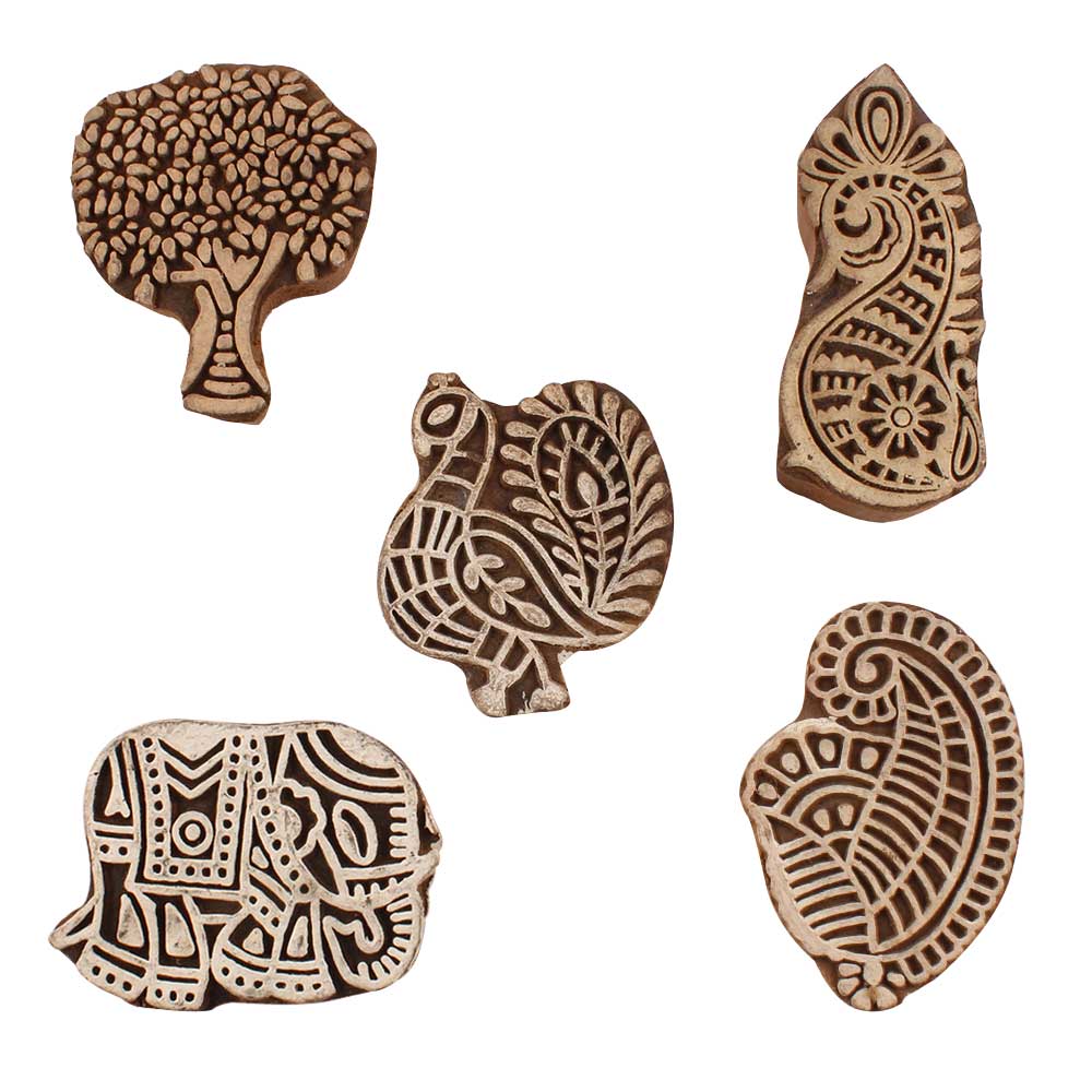 Set of 5 Piece New Mix Wooden Printing Blocks. Ideal for use on Fabric, Paper, Canvas, etc. These Blocks can be use to Print with Oil Colors, Fabric Colors, Water Colors, Acrylic Colors and Vegetable Colors.