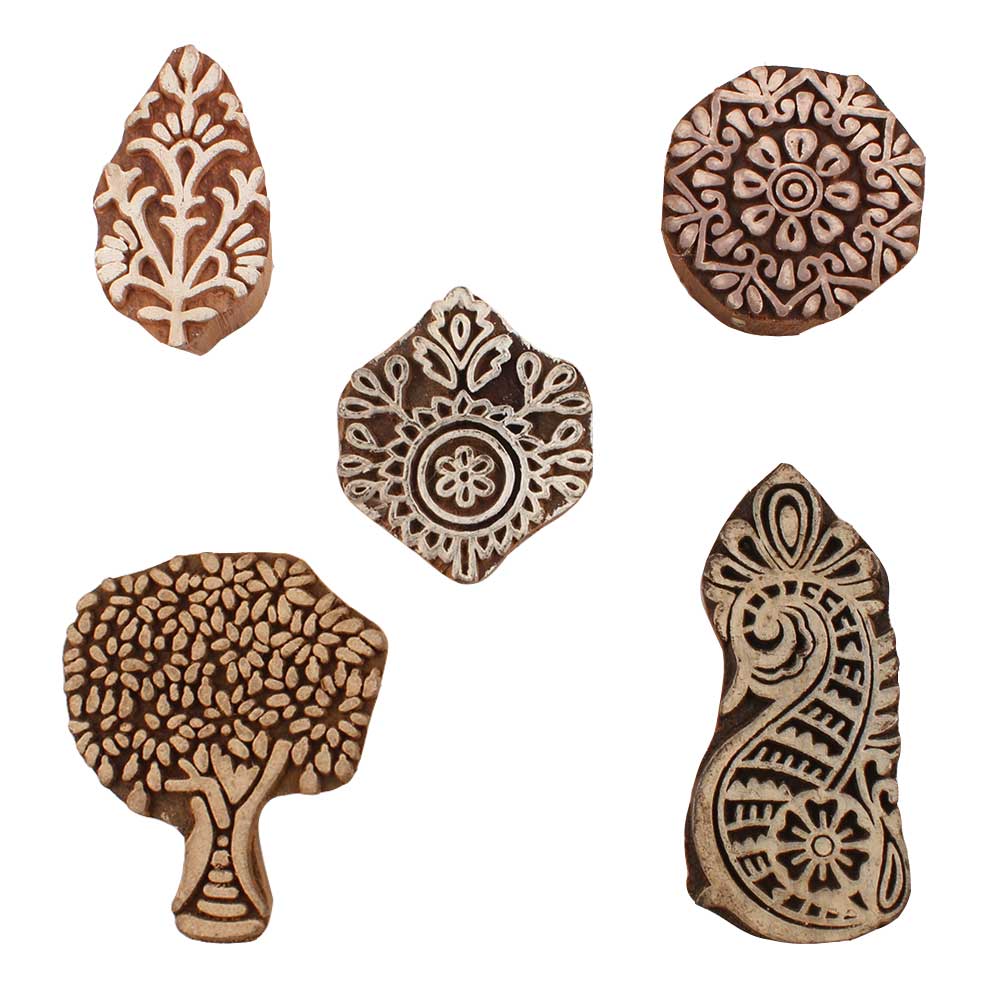 Set of 5 Piece New Mix Wooden Printing Blocks. Ideal for use on Fabric, Paper, Canvas, etc. These Blocks can be use to Print with Oil Colors, Fabric Colors, Water Colors, Acrylic Colors and Vegetable Colors.