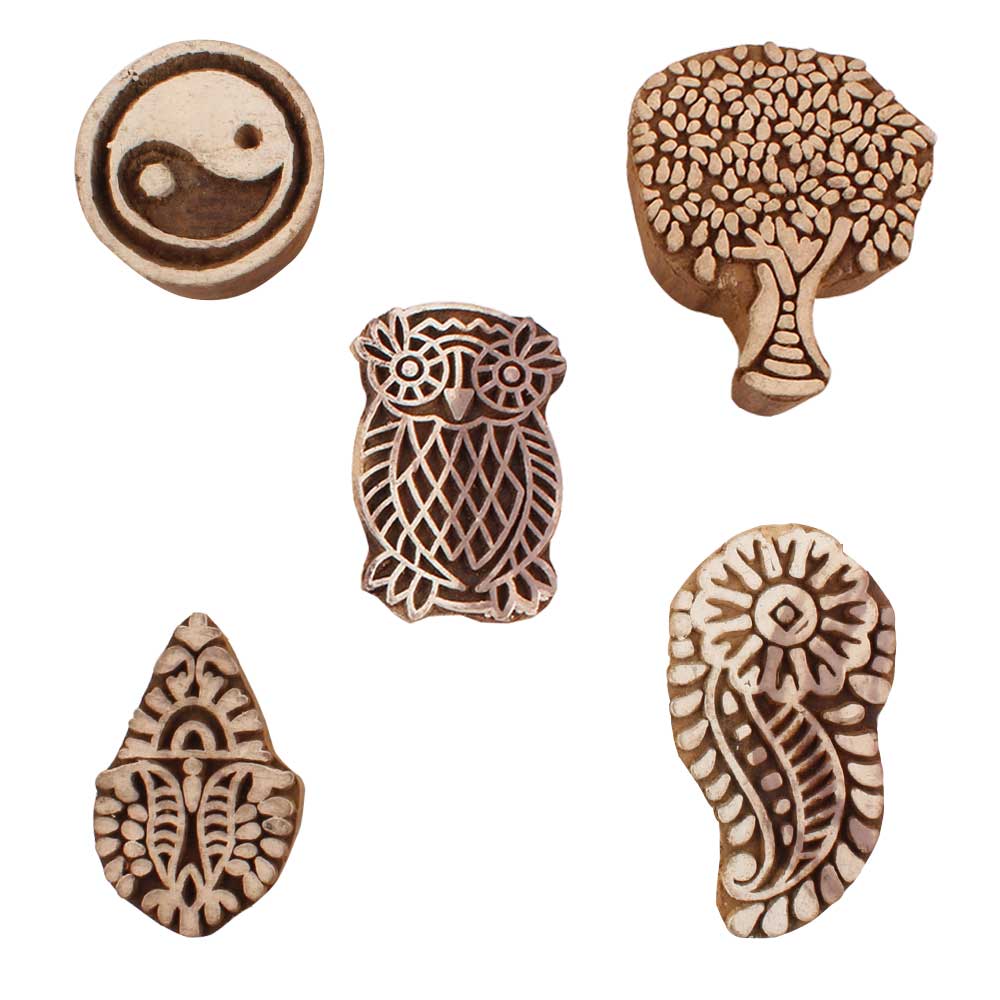 Set of 5 Piece New Mix Wooden Printing Blocks. Ideal for use on Fabric, Paper, Canvas, etc. These Blocks can be use to Print with Oil Colors, Fabric Colors, Water Colors, Acrylic Colors and Vegetable Colors.
