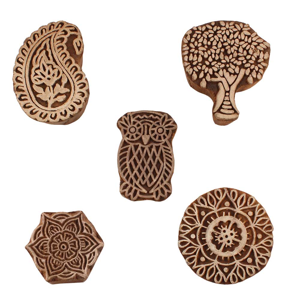 Set of 5 Piece New Mix Wooden Printing Blocks. Ideal for use on Fabric, Paper, Canvas, etc. These Blocks can be use to Print with Oil Colors, Fabric Colors, Water Colors, Acrylic Colors and Vegetable Colors.