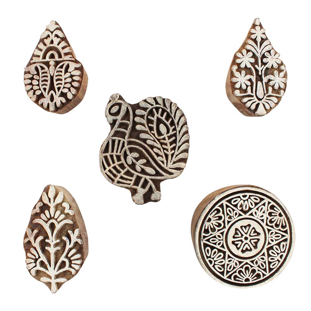 Set of 5 Piece New Mix Wooden Printing Blocks. Ideal for use on Fabric, Paper, Canvas, etc. These Blocks can be use to Print with Oil Colors, Fabric Colors, Water Colors, Acrylic Colors and Vegetable Colors.