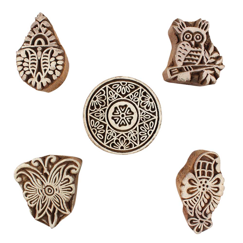 Set of 5 Piece New Mix Wooden Printing Blocks. Ideal for use on Fabric, Paper, Canvas, etc. These Blocks can be use to Print with Oil Colors, Fabric Colors, Water Colors, Acrylic Colors and Vegetable Colors.
