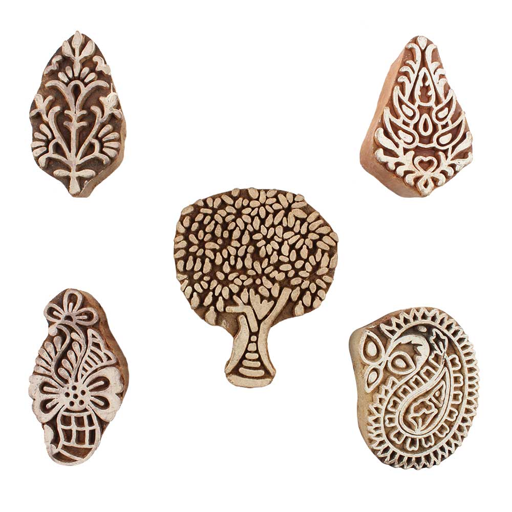 Set of 5 Piece New Mix Wooden Printing Blocks. Ideal for use on Fabric, Paper, Canvas, etc. These Blocks can be use to Print with Oil Colors, Fabric Colors, Water Colors, Acrylic Colors and Vegetable Colors.