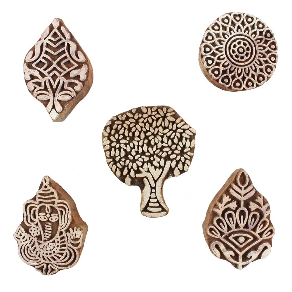 Set of 5 Piece New Mix Wooden Printing Blocks. Ideal for use on Fabric, Paper, Canvas, etc. These Blocks can be use to Print with Oil Colors, Fabric Colors, Water Colors, Acrylic Colors and Vegetable Colors.