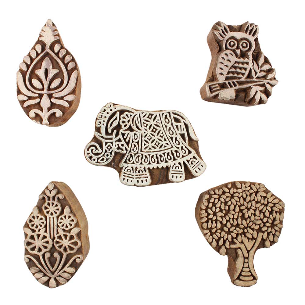 Set of 5 Piece New Mix Wooden Printing Blocks. Ideal for use on Fabric, Paper, Canvas, etc. These Blocks can be use to Print with Oil Colors, Fabric Colors, Water Colors, Acrylic Colors and Vegetable Colors.