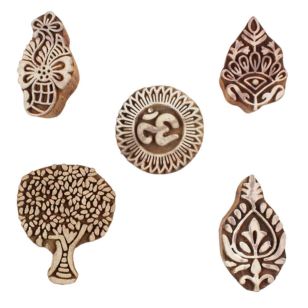 Set of 5 Piece New Mix Wooden Printing Blocks. Ideal for use on Fabric, Paper, Canvas, etc. These Blocks can be use to Print with Oil Colors, Fabric Colors, Water Colors, Acrylic Colors and Vegetable Colors.