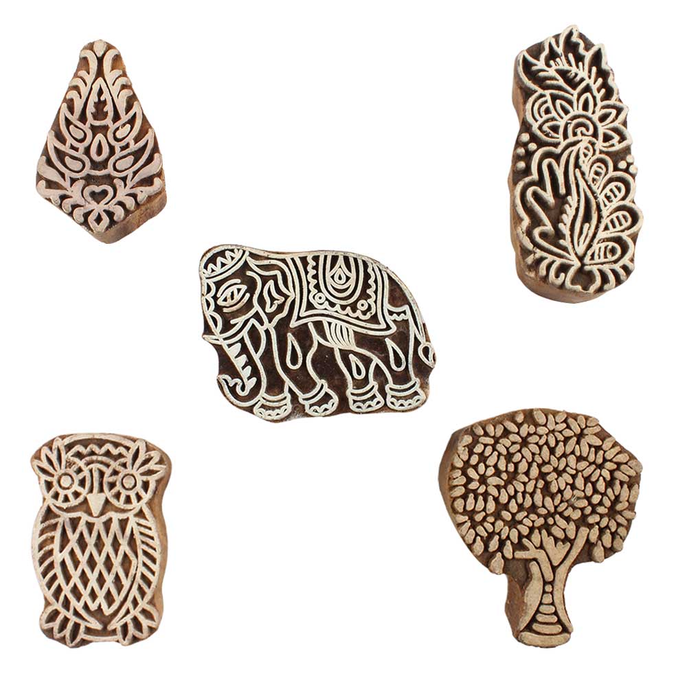 Set of 5 Piece New Mix Wooden Printing Blocks. Ideal for use on Fabric, Paper, Canvas, etc. These Blocks can be use to Print with Oil Colors, Fabric Colors, Water Colors, Acrylic Colors and Vegetable Colors.