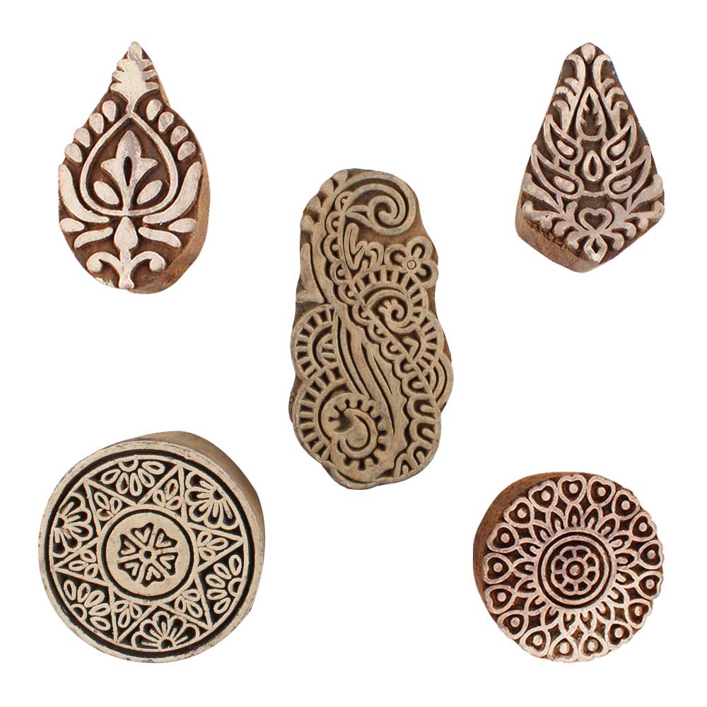 Set of 5 Piece New Mix Wooden Printing Blocks. Ideal for use on Fabric, Paper, Canvas, etc. These Blocks can be use to Print with Oil Colors, Fabric Colors, Water Colors, Acrylic Colors and Vegetable Colors.