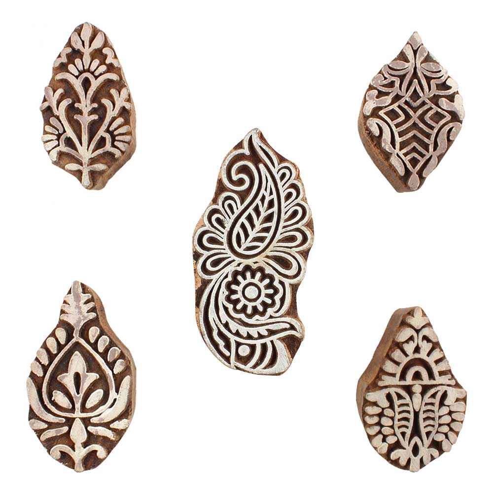 Set of 5 Piece New Mix Wooden Printing Blocks. Ideal for use on Fabric, Paper, Canvas, etc. These Blocks can be use to Print with Oil Colors, Fabric Colors, Water Colors, Acrylic Colors and Vegetable Colors.
