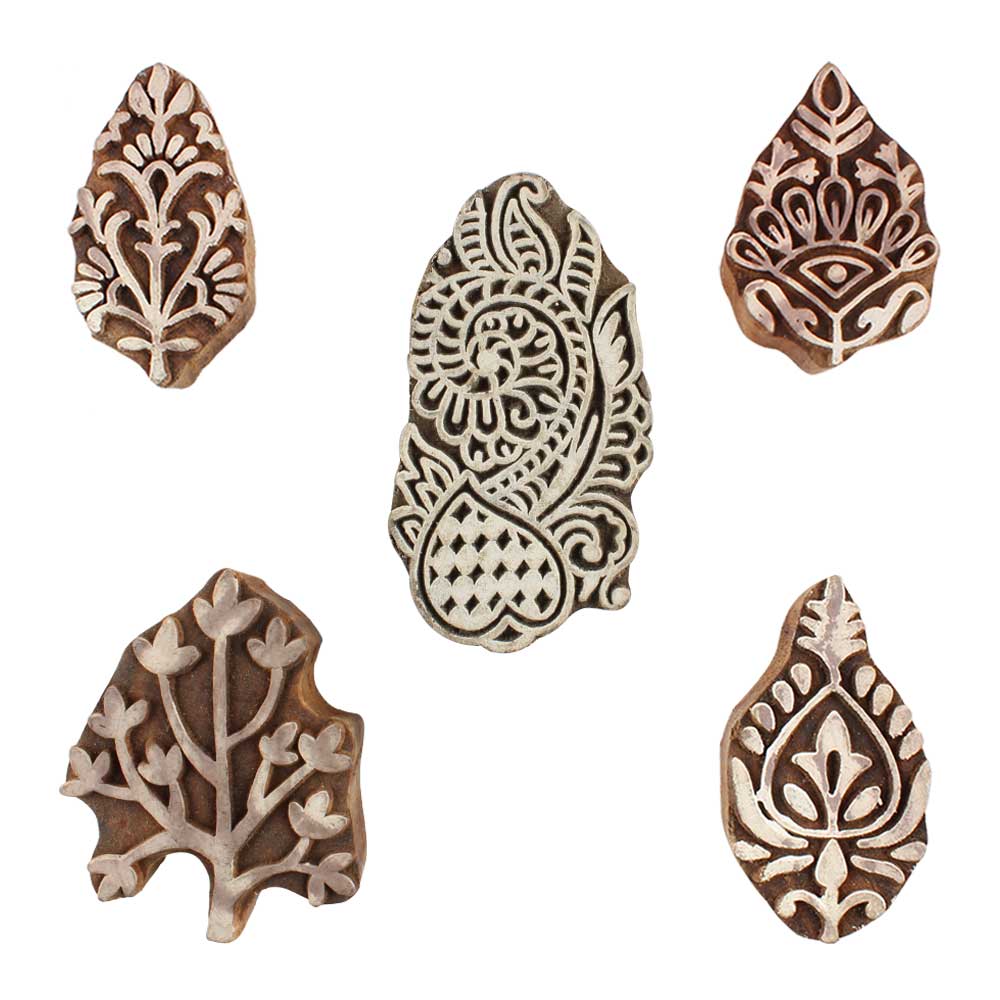 Set of 5 Piece New Mix Wooden Printing Blocks. Ideal for use on Fabric, Paper, Canvas, etc. These Blocks can be use to Print with Oil Colors, Fabric Colors, Water Colors, Acrylic Colors and Vegetable Colors.