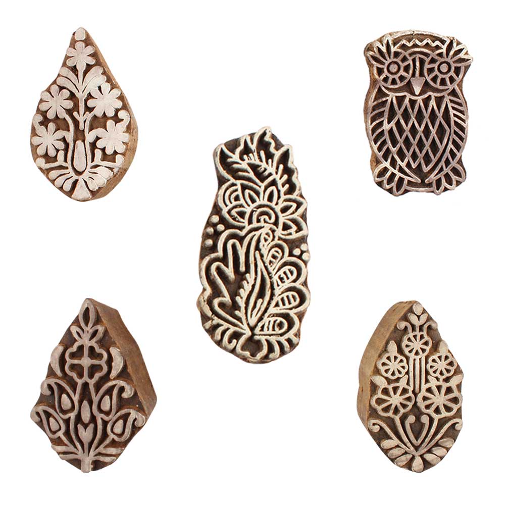 Set of 5 Piece New Mix Wooden Printing Blocks. Ideal for use on Fabric, Paper, Canvas, etc. These Blocks can be use to Print with Oil Colors, Fabric Colors, Water Colors, Acrylic Colors and Vegetable Colors.