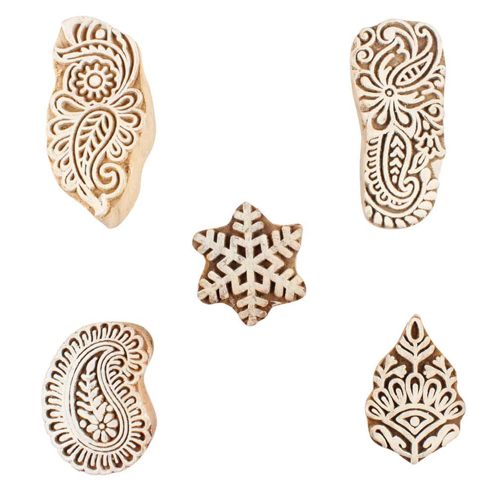 Set of 5 Piece New Mix Wooden Printing Blocks. Ideal for use on Fabric, Paper, Canvas, etc. These Blocks can be use to Print with Oil Colors, Fabric Colors, Water Colors, Acrylic Colors and Vegetable Colors.