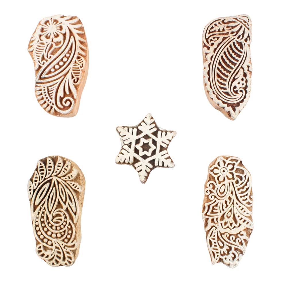 Set of 5 Piece New Mix Wooden Printing Blocks. Ideal for use on Fabric, Paper, Canvas, etc. These Blocks can be use to Print with Oil Colors, Fabric Colors, Water Colors, Acrylic Colors and Vegetable Colors.