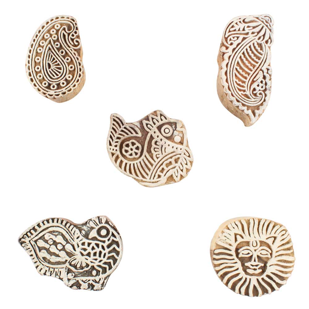 Set of 5 Piece New Mix Wooden Printing Blocks. Ideal for use on Fabric, Paper, Canvas, etc. These Blocks can be use to Print with Oil Colors, Fabric Colors, Water Colors, Acrylic Colors and Vegetable Colors.