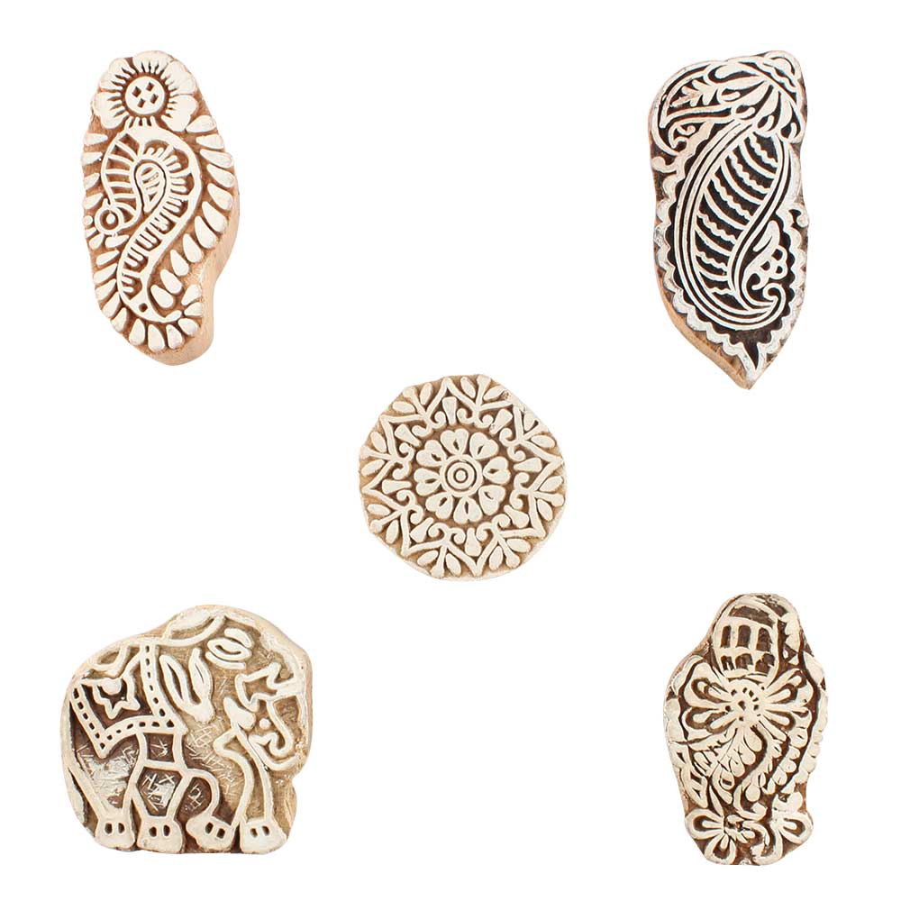 Set of 5 Piece New Mix Wooden Printing Blocks. Ideal for use on Fabric, Paper, Canvas, etc. These Blocks can be use to Print with Oil Colors, Fabric Colors, Water Colors, Acrylic Colors and Vegetable Colors.
