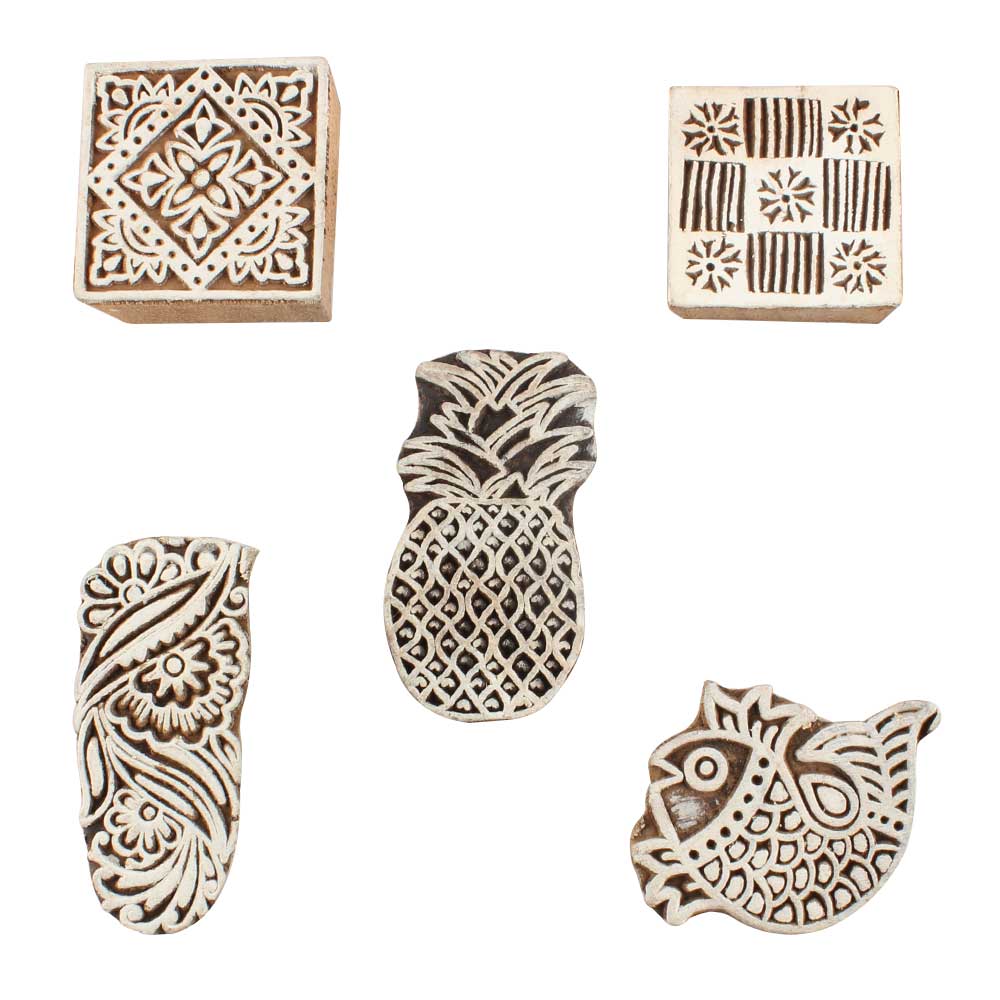 Set of 5 Piece New Wooden Printing Block. Ideal for use on Fabric, Paper, Canvas, etc. These Blocks can be use to Print with Oil Colors, Fabric Colors, Water Colors, Acrylic Colors and Vegetable Colors.