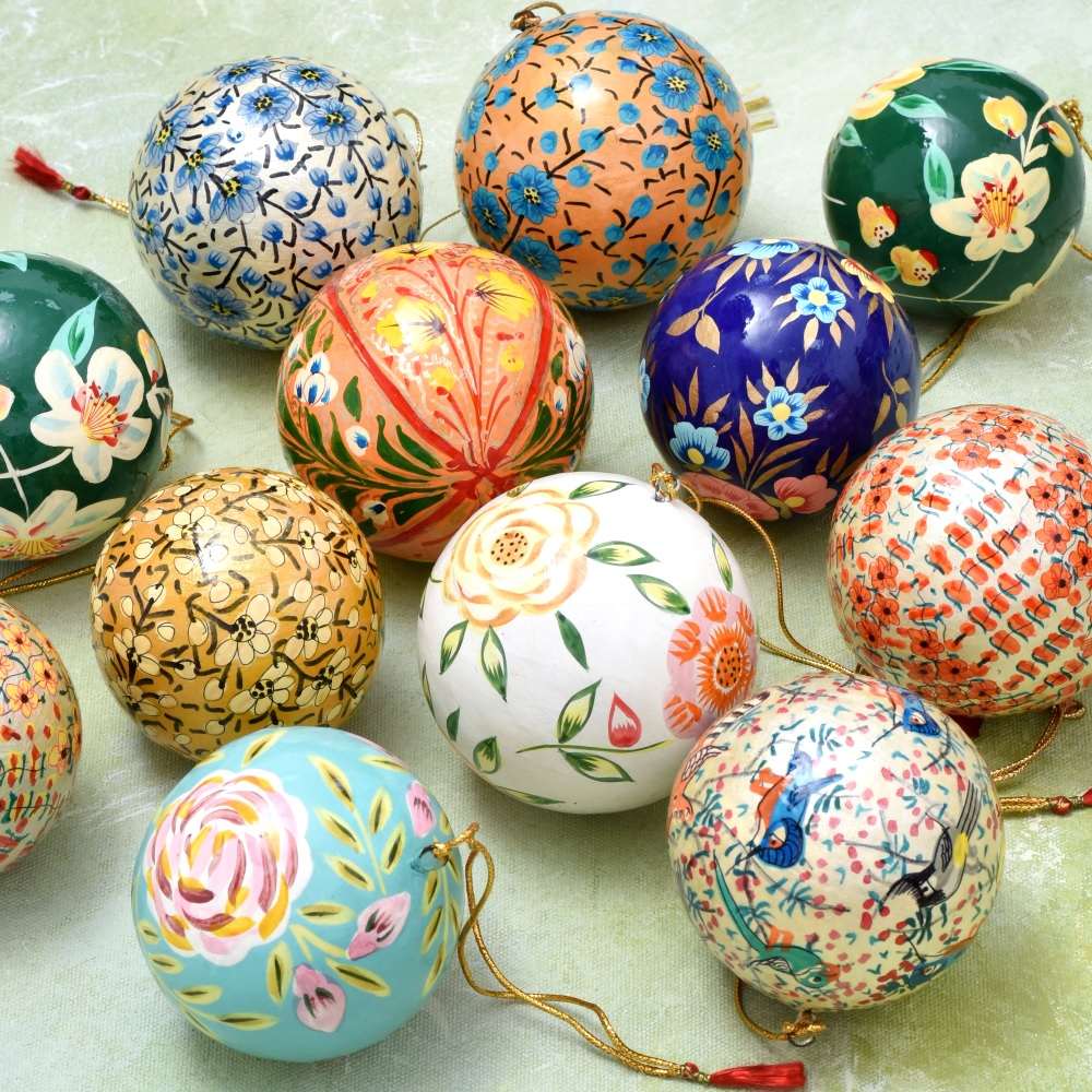 These round paper mache ornaments are a lovely and eco-friendly addition to your holiday decorations. Carefully handcrafted, each ornament showcases a rustic yet elegant design that adds warmth and charm to your Christmas tree.