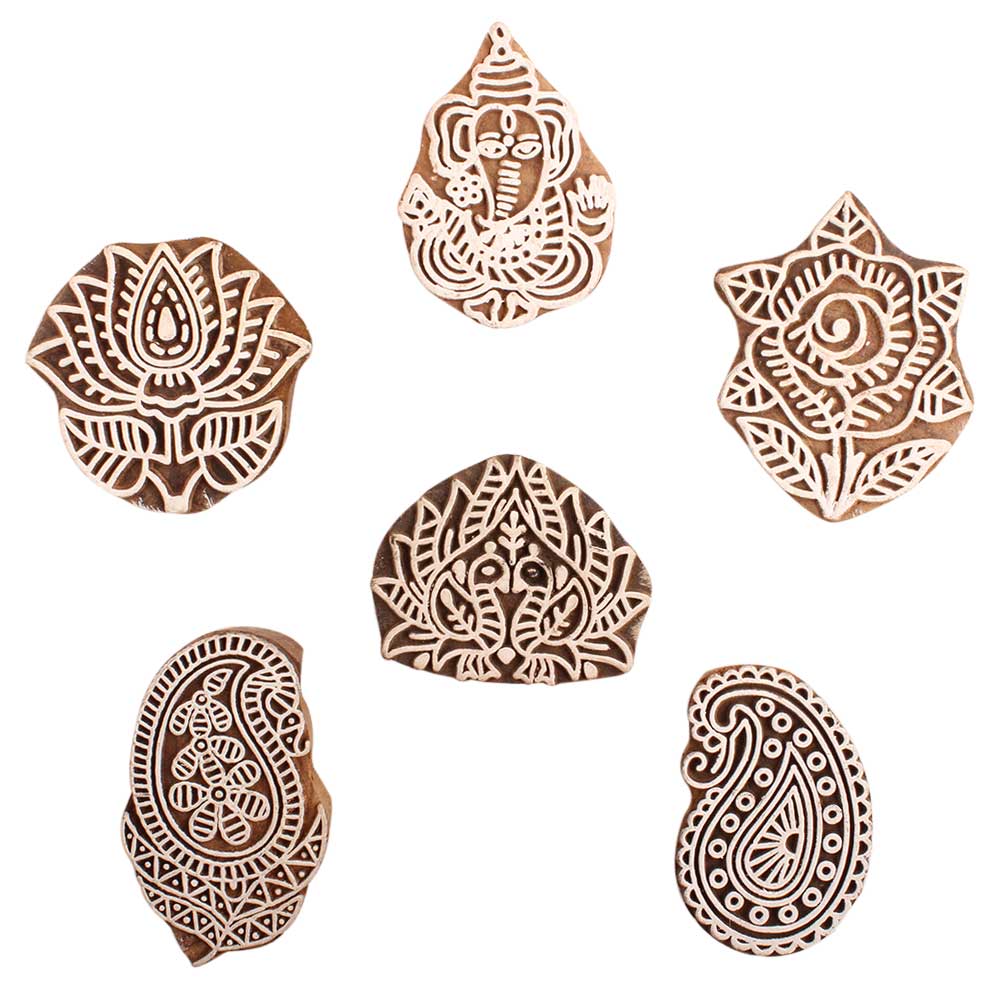 Set of 6 Piece New Mix Wooden Printing Block. Ideal for use on Fabric, Paper, Canvas, etc. These Blocks can be use to Print with Oil Colors, Fabric Colors, Water Colors, Acrylic Colors and Vegetable Colors.
