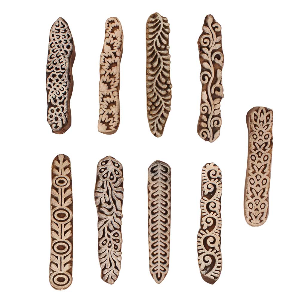 Set of 9 Piece New Mix Wooden Printing Blocks. Ideal for use on Fabric, Paper, Canvas, etc. These Blocks can be use to Print with Oil Colors, Fabric Colors, Water Colors, Acrylic Colors and Vegetable Colors.