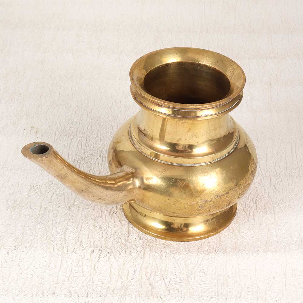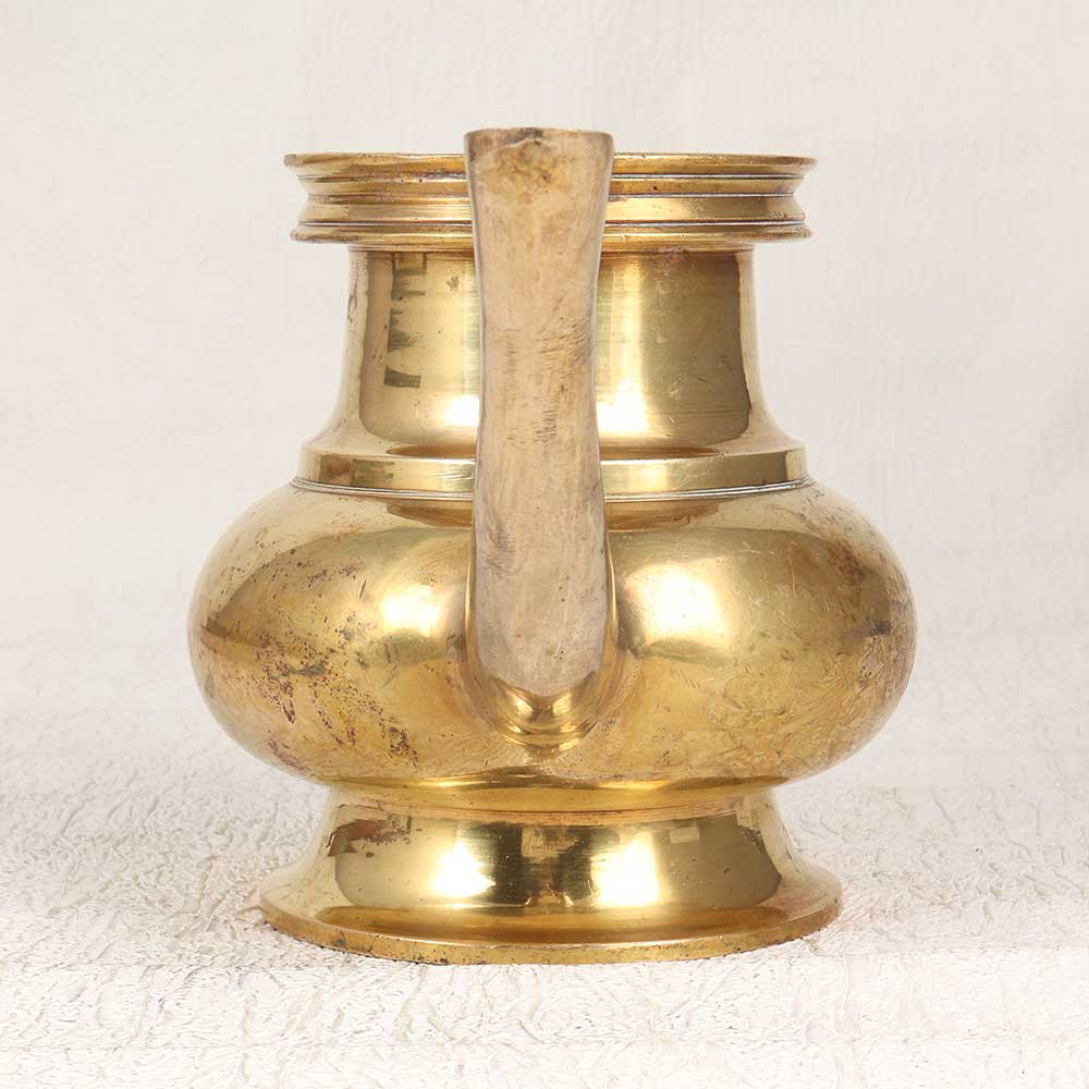 Transport your home to an ancient Indian temple with this handcrafted brass water pot. Shining with a brilliant golden luster, this vessel's graceful curved spout will make every pour feel like a divine ritual. In India, water is treated with utmost reverence. This special pot allows you to uphold tradition by using it exclusively for holy water. Place it in your meditation space or puja room to store water for rituals and offerings. The smooth, drip-free spout creates a serene pouring experience. Whether you're using it for spiritual practices or simply keeping hydrated, this vessel brings a taste of the divine into your everyday. Bring the rich tradition of India into your home with this handcrafted brass water pot. With its antique elegance and sacred aura, it's sure to be a treasured item.