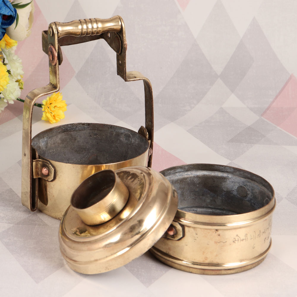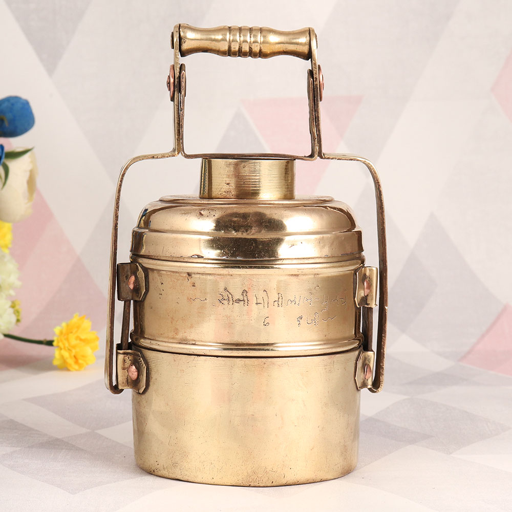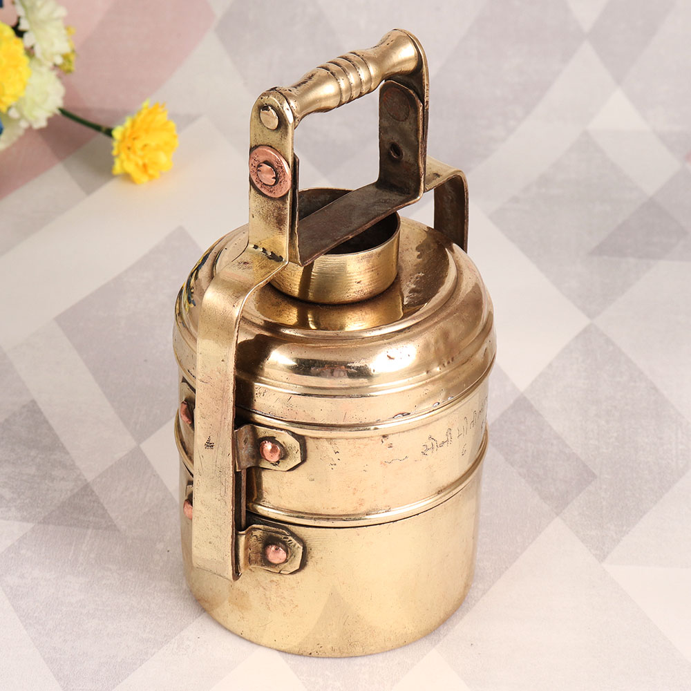 This Brass Tiffin Box with a captivating antique brown finish is a testament to the craftsmanship of highly skilled Indian artisans. Handmade from high-quality brass, this unique piece tells a story of tradition and heritage. Originally designed for practicality, this vintage treasure now transcends its functional roots and beckons as a remarkable decorative item. Featuring two compartments, this tiffin box boasts a lock mechanism that echoes the nostalgia of days gone by. Its rich, antique brown finish adds an air of sophistication and elegance to any setting. Whether adorning the dining table at home, adding character to your office space, enhancing the ambiance of a restaurant, hotel, or cafe, this brass tiffin box promises to be a conversation starter. Its versatility knows no bounds. As a thoughtful gift, it holds the power to evoke feelings of nostalgia and appreciation on special, festive, or auspicious occasions. Embrace the charm of vintage India with this stunning Brass Tiffin Box, a true masterpiece of artistry and history combined.