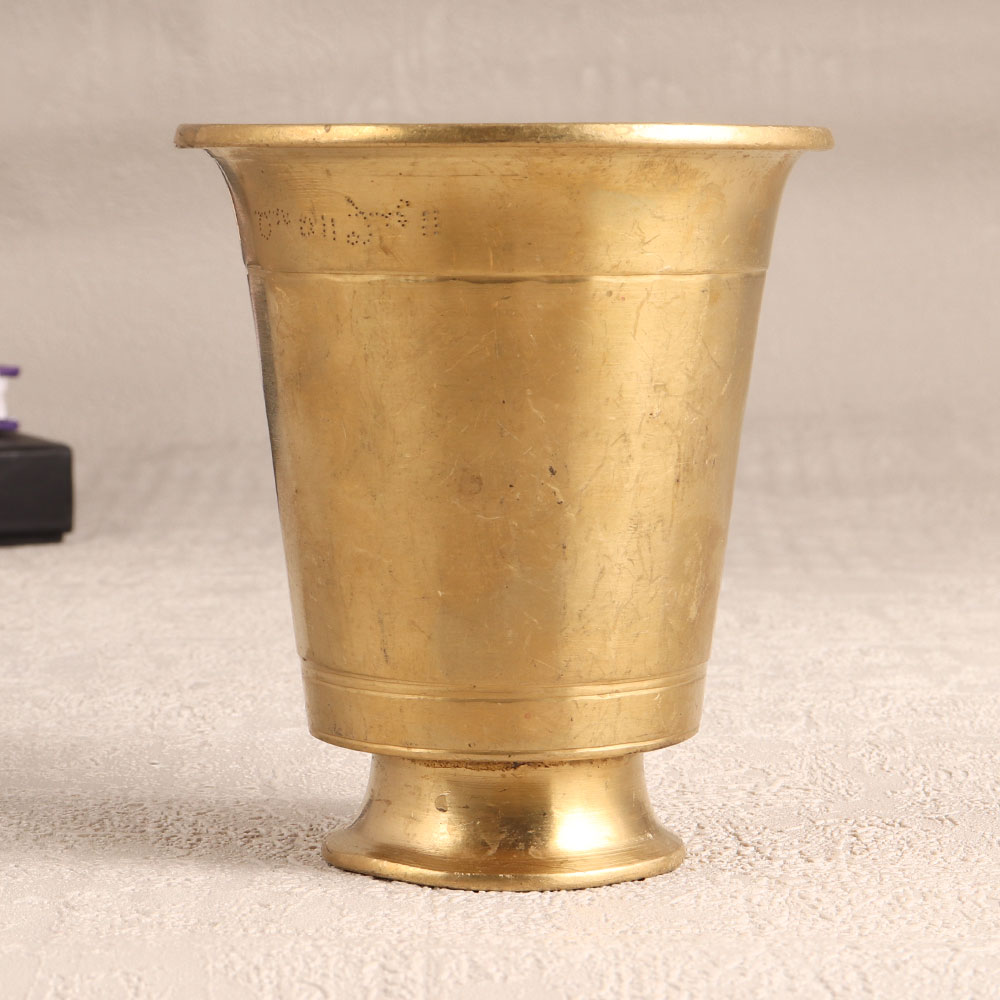 Immerse yourself in the timeless elegance of this Vintage Brass Holy Water Glass that is crafted with precision and devotion by highly talented Indian artisans in the rich tradition of South Indian Art. This magnificent piece exudes an air of antiquity, boasting a lustrous brown finish that mirrors the passage of time, making it a charming addition to your collection of vintage treasures. Handcrafted from premium brass, this holy water glass is not only a testament to superior craftsmanship but also a vessel of spiritual significance. Use it during prayer, havan, or various rituals to hold holy water, adding a sacred touch to your religious ceremonies. Its versatility is unmatched, as it can grace any setting, be it your home, office, restaurant, hotel, or cafe's prayer room. Furthermore, its aesthetic allure makes it an ideal choice for floral decorations, infusing beauty and spirituality into your space. Whether for yourself or as a thoughtful gift, this Vintage Brass Holy Water Glass is perfect for special, festive, or auspicious occasions, symbolizing both reverence and artistic brilliance from the heart of India.