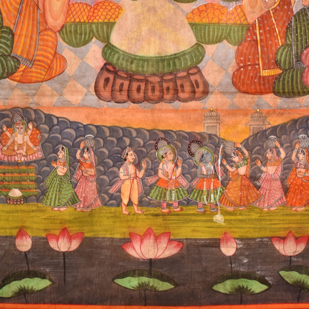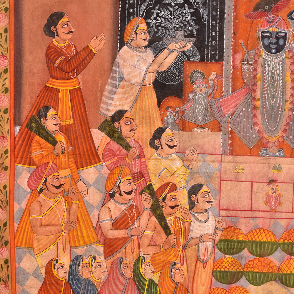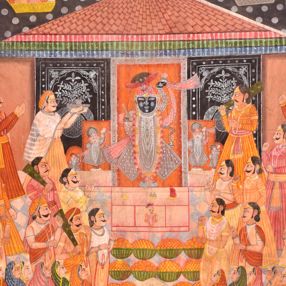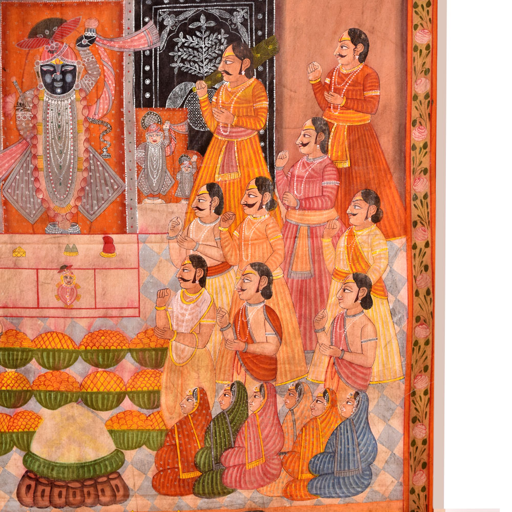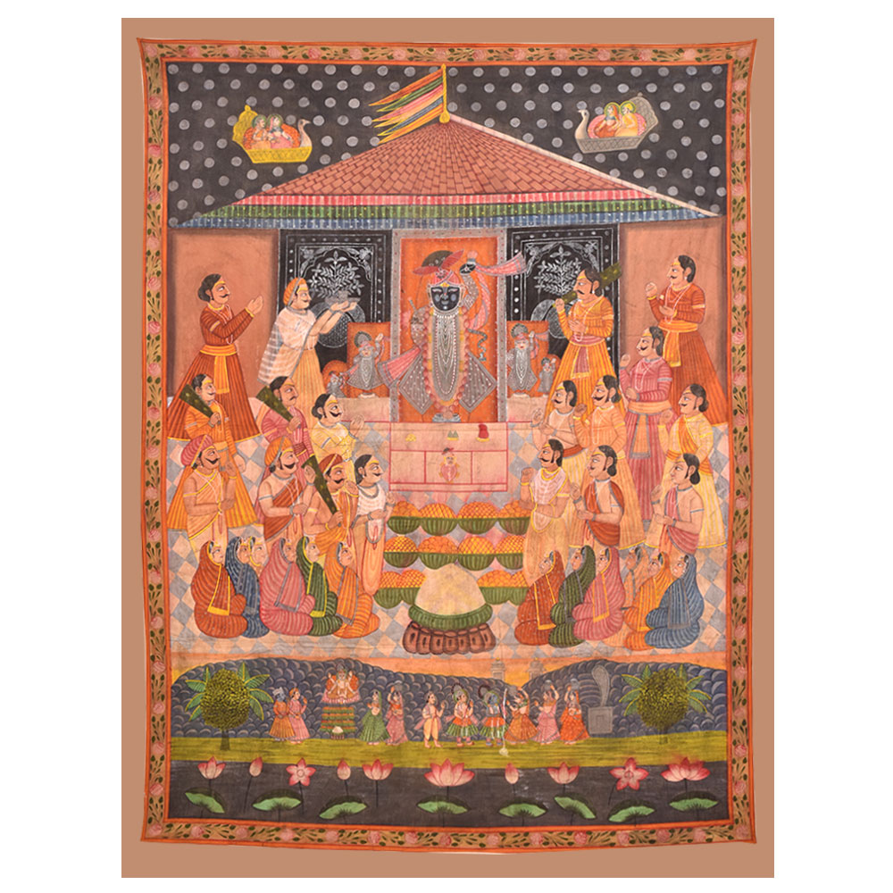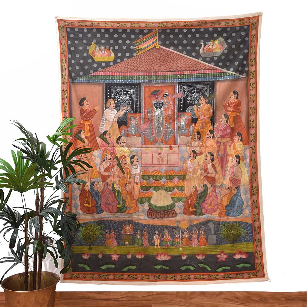 Shrinath Ji Chappan Bhog Pichwai painting is a traditional form of Indian art closely associated with worshipping Lord Krishna in the form of Shrinath Ji. The painting depicts the offering of 56 different types of food or Chappan Bhog to the deity. The picture is typically created on a large piece of fabric, which is then hung behind the idol of Shrinath Ji in temples. The Chappan Bhog offering is an essential aspect of the worship of Shrinath Ji, and the painting is designed to convey the devotion and reverence of the devotees. The painting is created using bright, vibrant colours and gold or silver foil, intended to symbolize the divinity and grandeur of the deity. The god is usually depicted seated on a throne or swing, surrounded by numerous food items such as sweets, fruits, and other luxuries. The food is laid out symmetrically, with the most essential things in the middle. The painting's backdrop is generally embellished with elaborate patterns and decorations that add to the overall attractiveness of the artwork. A Shrinath Ji Chappan Bhog Pichwai art is a time-consuming technique requiring high talent and attention to detail. The painters draw the design onto the cloth and produce exquisite intricacies and patterns with brushwork and hand-stitching. Shrinath Ji Chappan Bhog Pichwai art is a significant element of India's cultural history, and it is loved by Shrinath Ji's followers worldwide. It is regarded not only as a piece of art but also as a method of showing devotion and asking for the deity's favours. The complex patterns and vivid colours continue to inspire artists and believers alike, and the artwork is a significant element of India's rich cultural tradition.