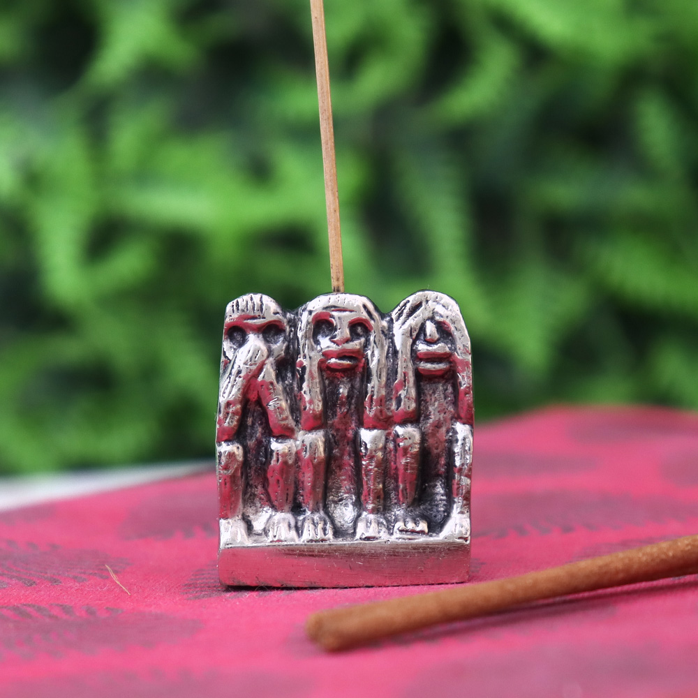A beautiful vintage recreation of the traditional brass three wise Monkeys is displayed. The three mystic apes, as they are sometimes known, represent a visual maxim. They represent the adage "see no evil, hear no evil, speak no evil" as a unit. Because they double as decorative accent pieces and incense burners, these three brass pieces are distinctive. It comes in silver finish.