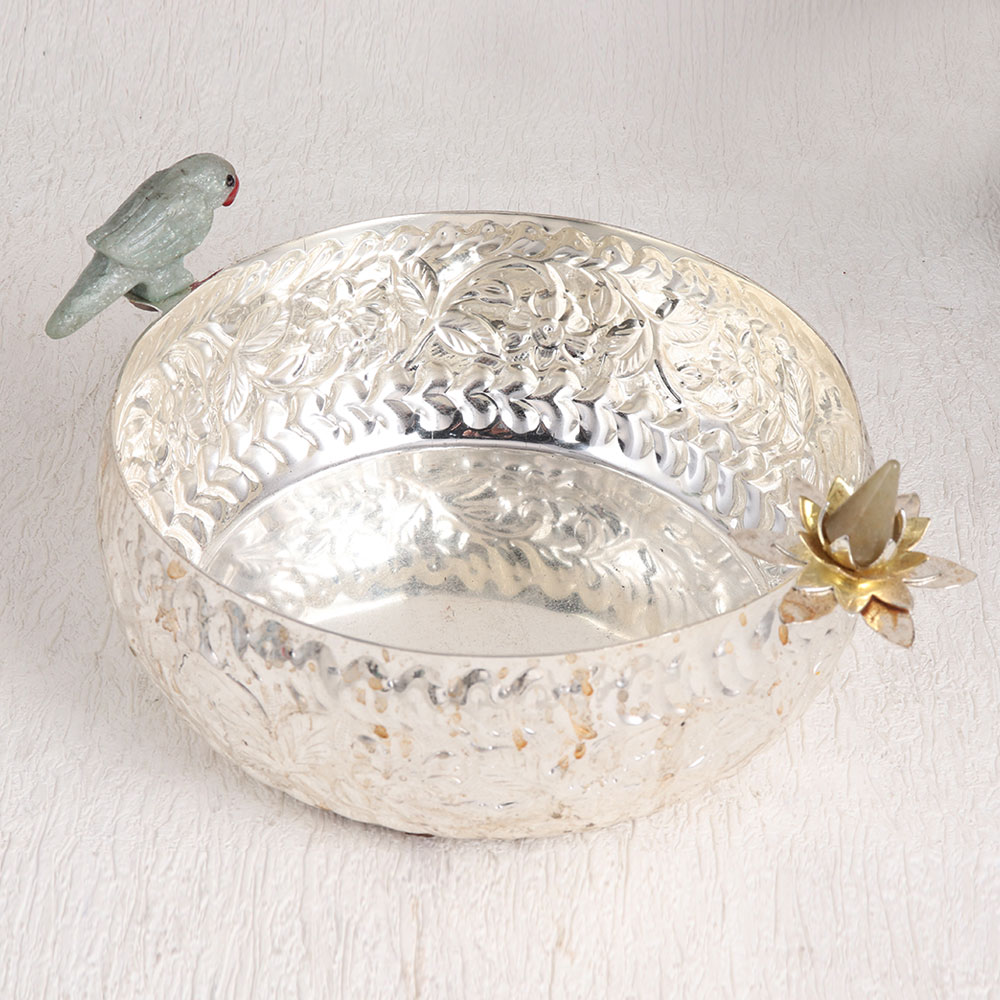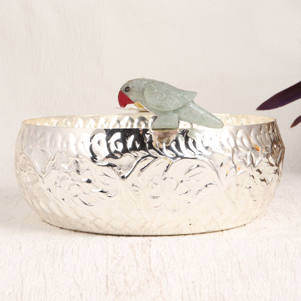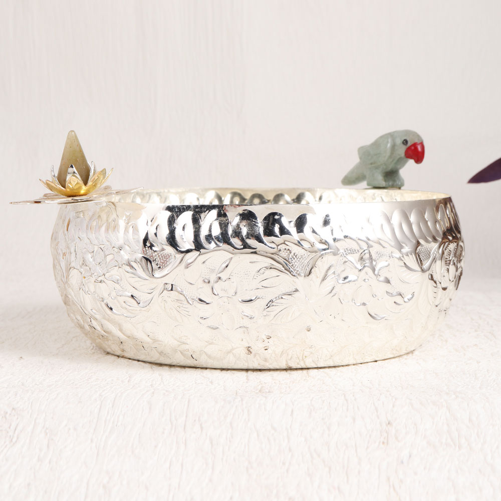 Decorate your interior with the exquisite craftsmanship of this European Art-inspired white metal bowl. This round masterpiece boasts a radiant silver finish, crafted by highly skilled artisans. Its stunning design is a harmonious blend of tradition and elegance, featuring an ornate lotus and a charming parrot carved delicately along its edge, bringing a touch of nature's grace to any space. This versatile bowl is an artful addition to your home, office, hotel, cafe, shop, or restaurant, making it an ideal choice for both personal and commercial settings. Placed as a centerpiece or on a mantel, it adds an aura of sophistication and serenity. As a thoughtful gift, it's perfect for commemorating special moments, festive celebrations, or auspicious occasions, symbolizing the beauty of intricate craftsmanship and timeless design. Embrace the allure of this white metal bowl, an embodiment of elegance, artistry, and the rich European tradition, destined to enhance your surroundings and captivate the hearts of your loved ones.