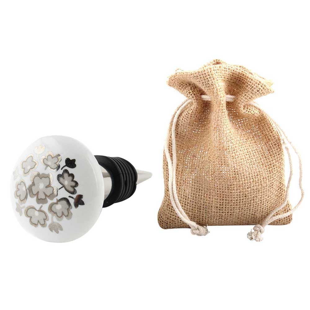 Silver Flower Flat Ceramic Wine Bottle Stopper. Zinc Alloy Wine Bottle Stopper with Attractive Jute Bag Packaging.