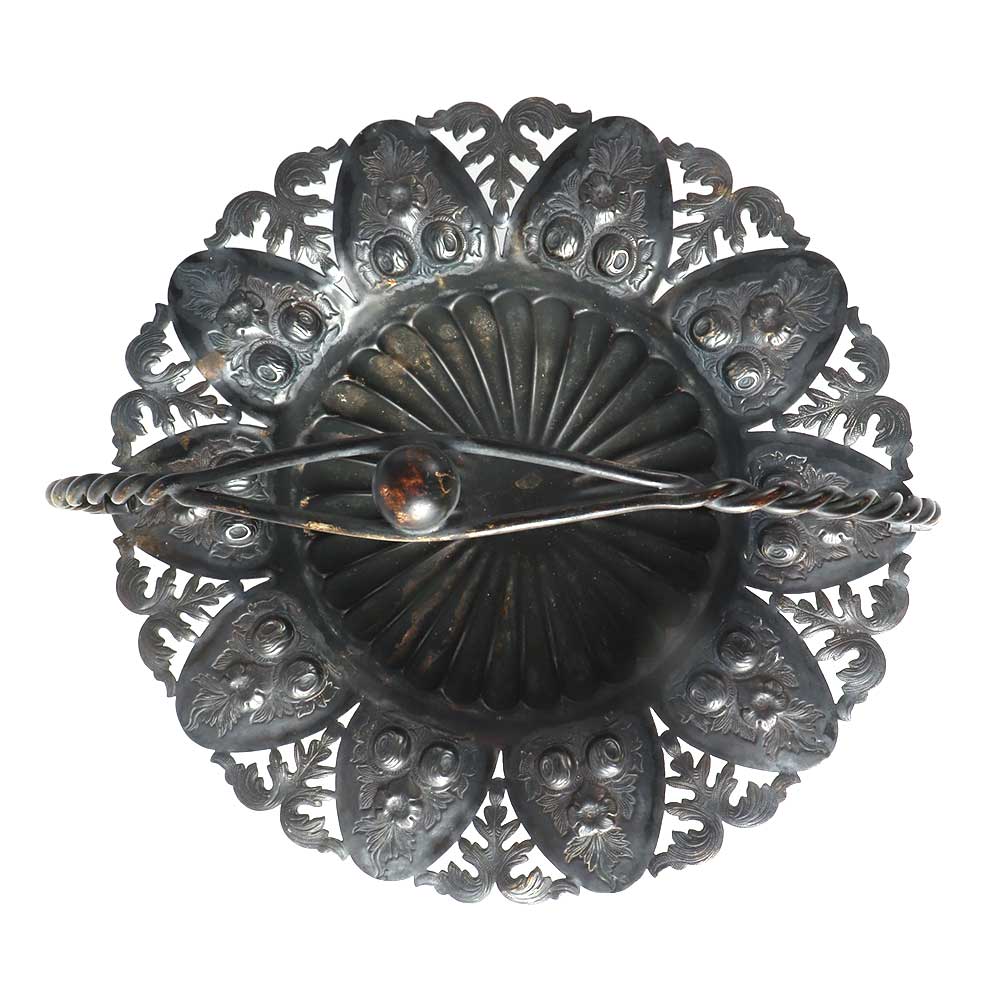 An elegantly pierced Victorian fruit or bridal basket made of English silver metal with an elaborate handle that has an attractive border with elevated scrolls, foliage, and flowers design  The handle is simply detachable from the sides and may be moved backwards and forwards. Use it as a candy dish, for flower presentation or as a fruit basket.Â