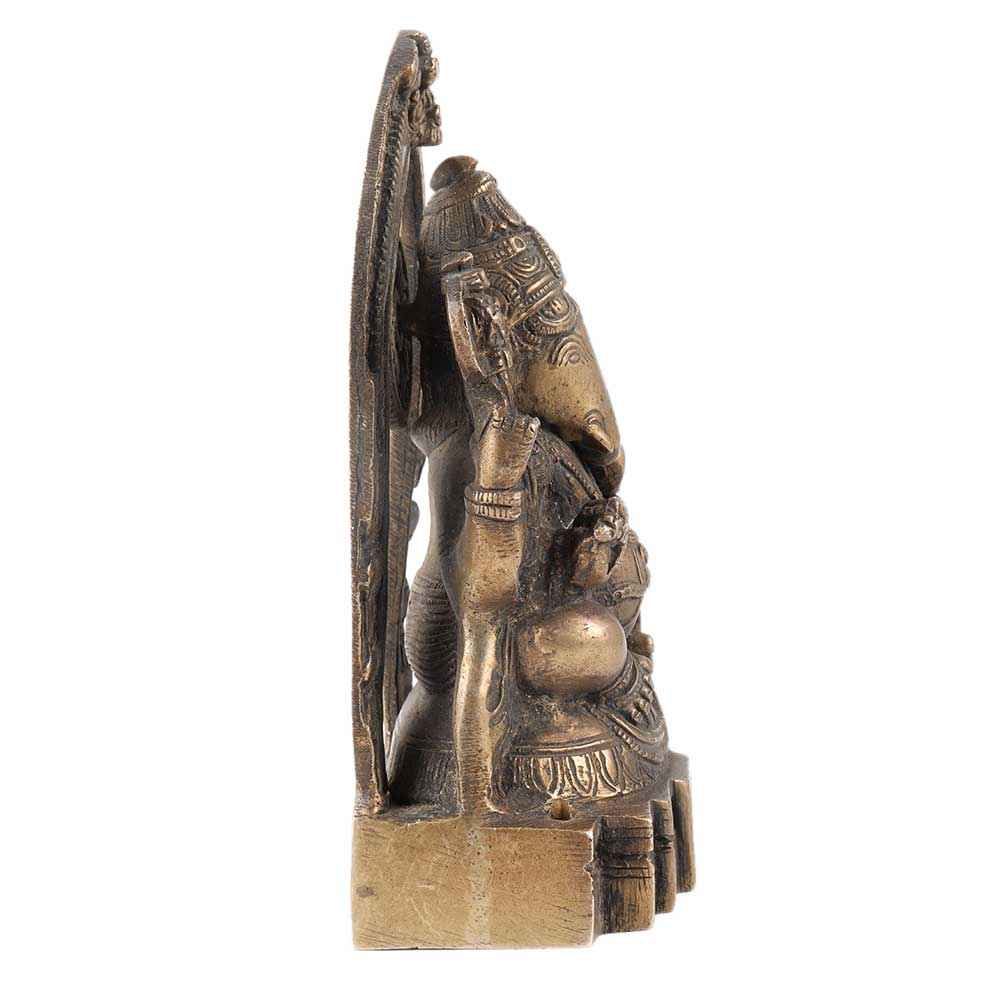 Lord Ganesha's idol is crafted from brass and has a brown aged finish. Lord Ganesha and his vahana, the Indian bandicoot rat, are depicted with stunning carvings and a gorgeous arch behind them. This idol can be used in pooja rooms, exhibits, showrooms, and offices at home. Perfect gift for weddings, formal occasion, Navarathri, Deepawali, and other special occasions.