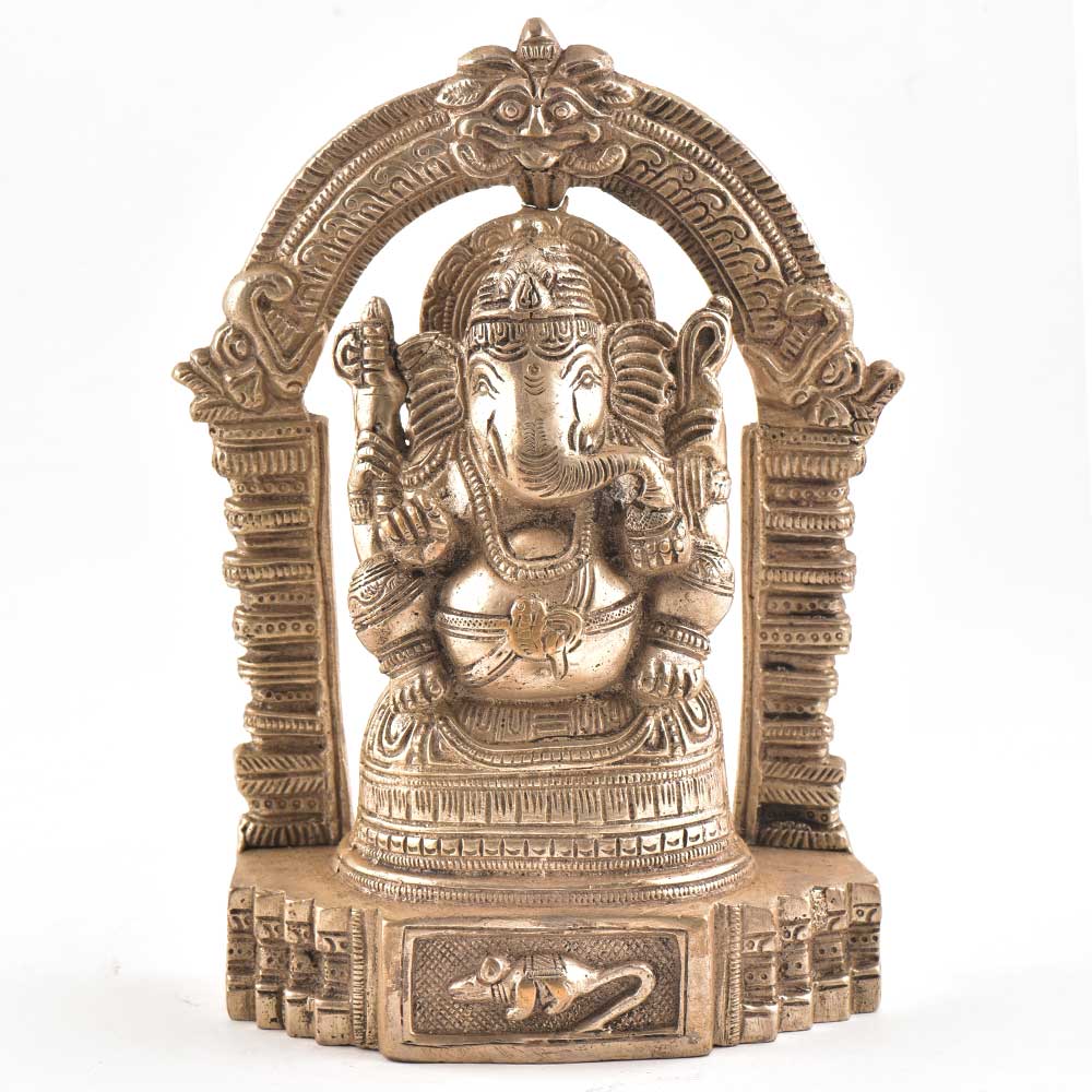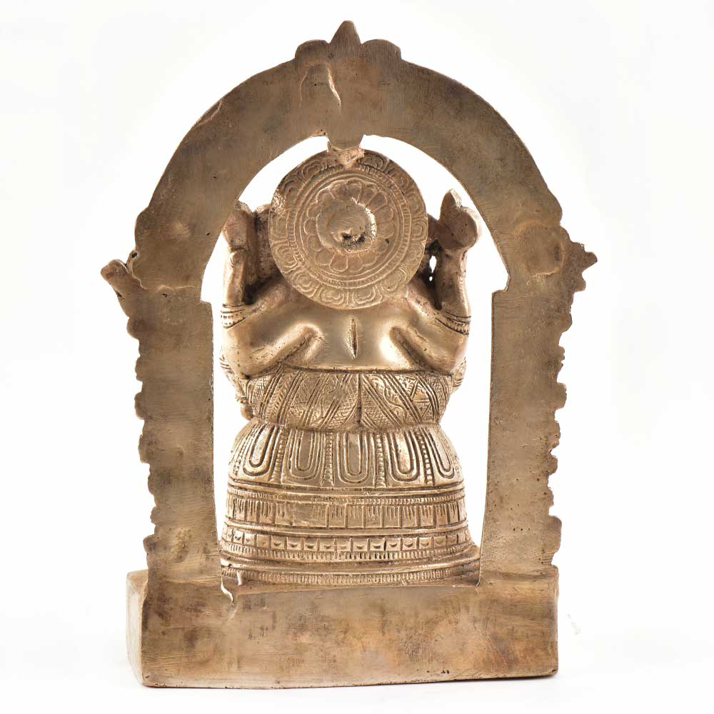 Seated brass ganesha seated on a lotus with an arch in the background ( also called prabhavali)It is complete with two yalis on either side of her and Mahakala or "great time" above her head. In this brass sculpture and posture Lord Ganesha is depicted with his four hands. The upper right hand has a ‘Pharsa’ or an axe symbolizing cutting attachment bonds. The lower right hand is raised with palm facing outwards away from the body with fingers flexed. This hand gesture is called ‘Abhayamudra’ that offers protection for all from all evils. The upper left hand is shown holding a conch, ‘Shankha’ in Hindi. The sound of the conch is considered pious in Hinduism and represents the call to come and pray. The lower left hand holds a special sweet called ‘Modak or Laddoo’.