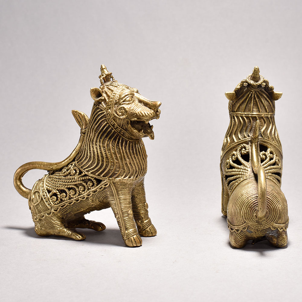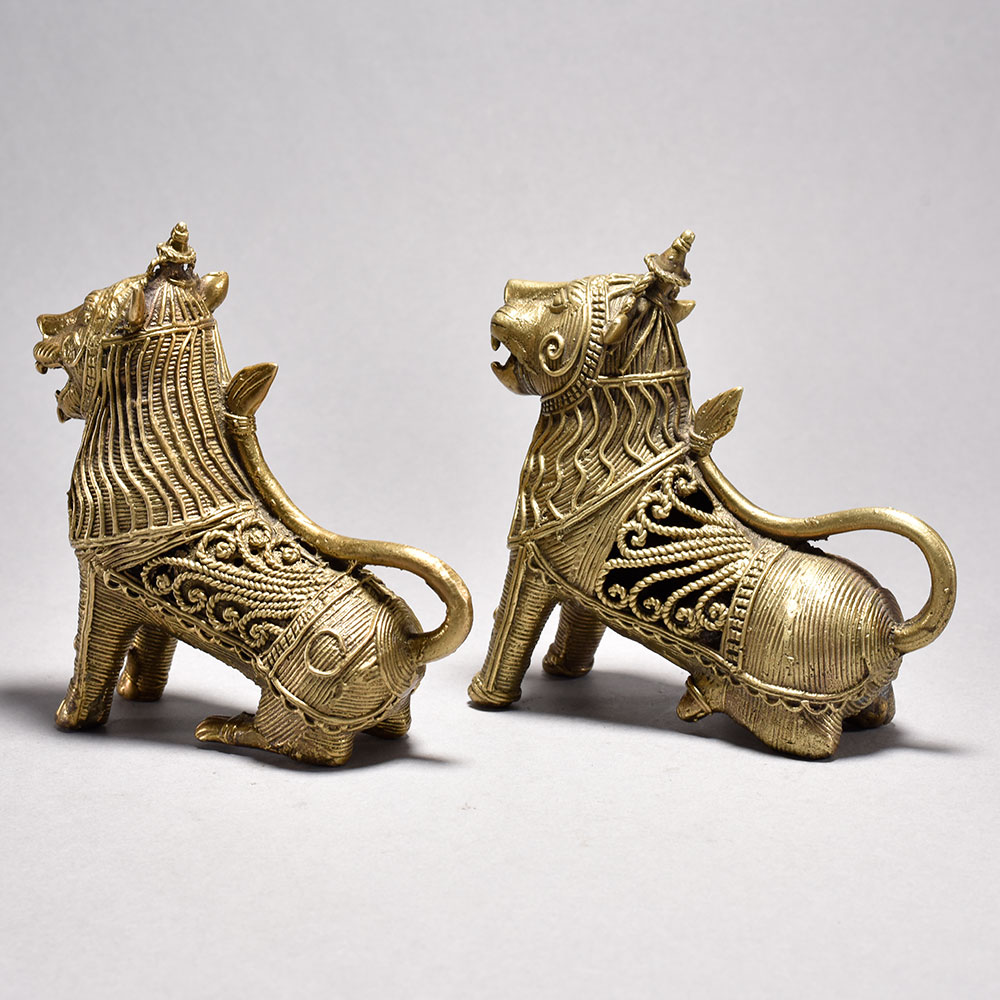 Unleash the majestic power of the wild with this stunning tribal art lion pair.These captivating lion sculptures are a testament to the rich cultural heritage of India. Meticulously crafted using time-honored techniques, each detail has been lovingly rendered to perfection. Display this pair and let their commanding presence transport you to the heart of the untamed wilderness. A breathtaking addition to any space, these lions will elevate your decor while sparking wonder and admiration in all who behold them. Handcrafted from metal using the traditional lost wax casting process This timeless piece is handcrafted by skilled artisans using time-honored techniques, ensuring each creation is truly one of a kind. Its versatile design makes it suitable for living rooms, bedrooms, offices, or meditation spaces, bringing a sense of heritage and style wherever it is displayed. This timeless piece is handcrafted by skilled artisans using time-honored techniques, ensuring each creation is truly one of a kind. Its versatile design makes it suitable for living rooms, bedrooms, offices, or meditation spaces, bringing a sense of heritage and style wherever it is displayed.