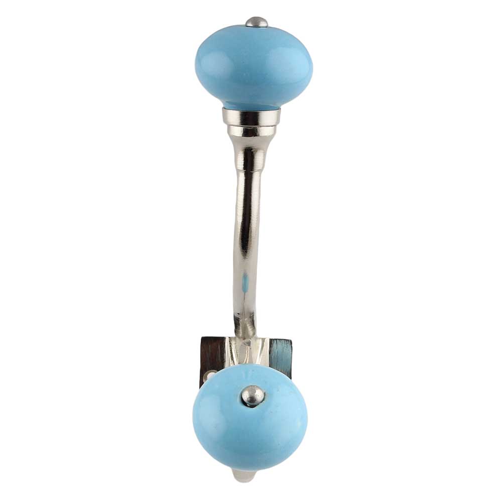 Finish: Glossy sky blue ceramic top; brushed silver iron hook