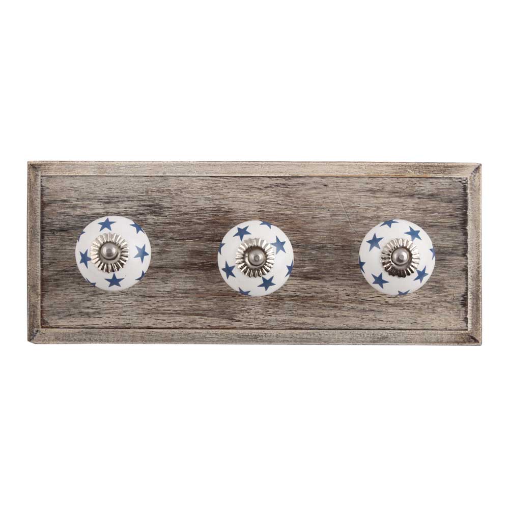 Slate Blue Star Ceramic Wooden Hook. A Perfect Complement to the Soft Tone of the Wood are these White Traditional Hat & Coat Hook Made of Genuine Porcelain and Brass. It can be use to Hang Jewellery, Leashes, Towels, Scarves, Light Weight Sweaters, Caps Etc.