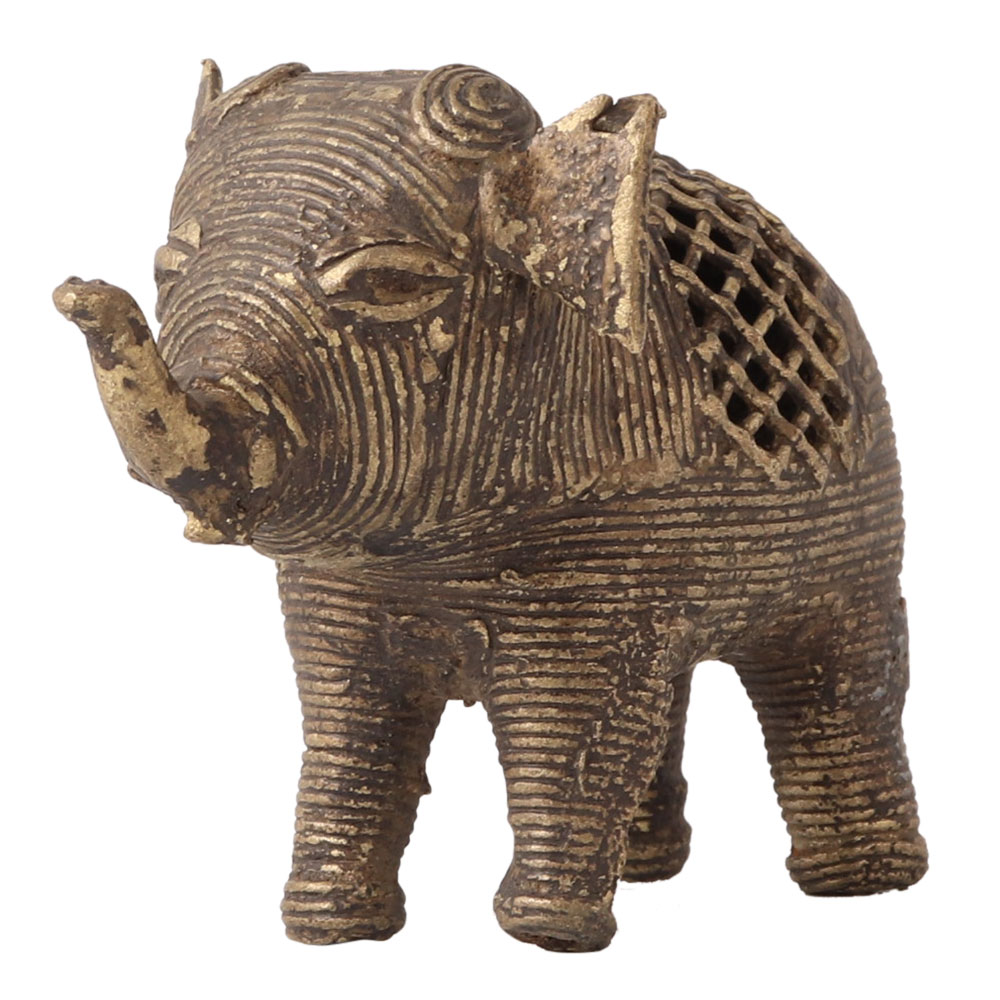 A small brass statue of an elephant handcrafted by skilled Indian artisans using traditional methods. This brass statue has an antique brown finish and made with intricate details and jali work. Elephants are widely revered in India and other Eastern cultures to bring prosperity, luck and positivity in the home. According to Vastu, placing an elephant statue at home, office, restaurant or hotel is auspicious and spreads positivity in the environment. An incredible feature to add to your vintage art collection. Place this exquisite artefact on your table, desk, shelf, reception, billing counter or altar. An auspicious gift for any special, festive and auspicious occasion for your loved ones and relatives.