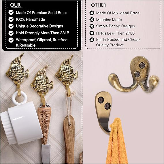 Compact & Functional: Nautical-Inspired Design: Long-Lasting Quality: Naturally Antimicrobial: Use a row of these brass fish hooks in your hallway or mudroom for a coordinated, ocean-themed storage solution that’s both fun and functional.