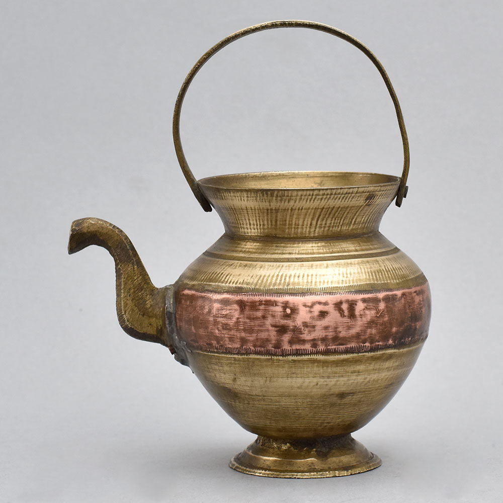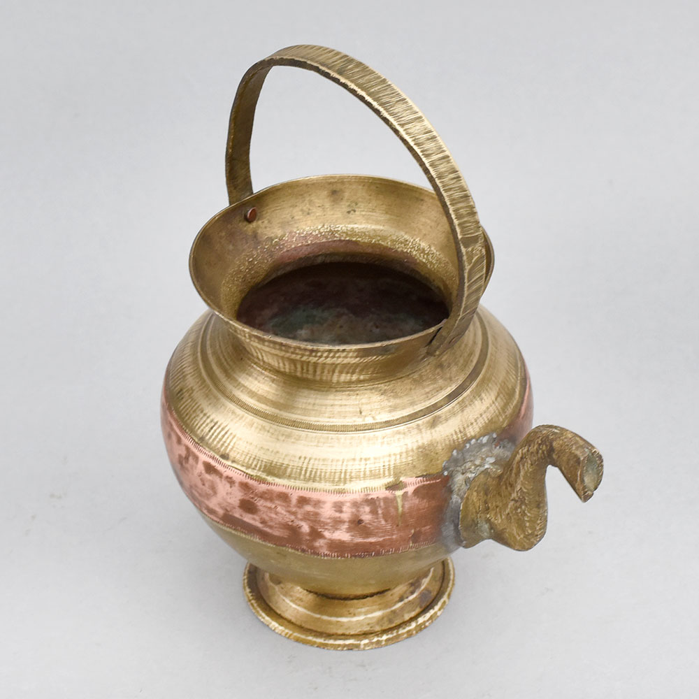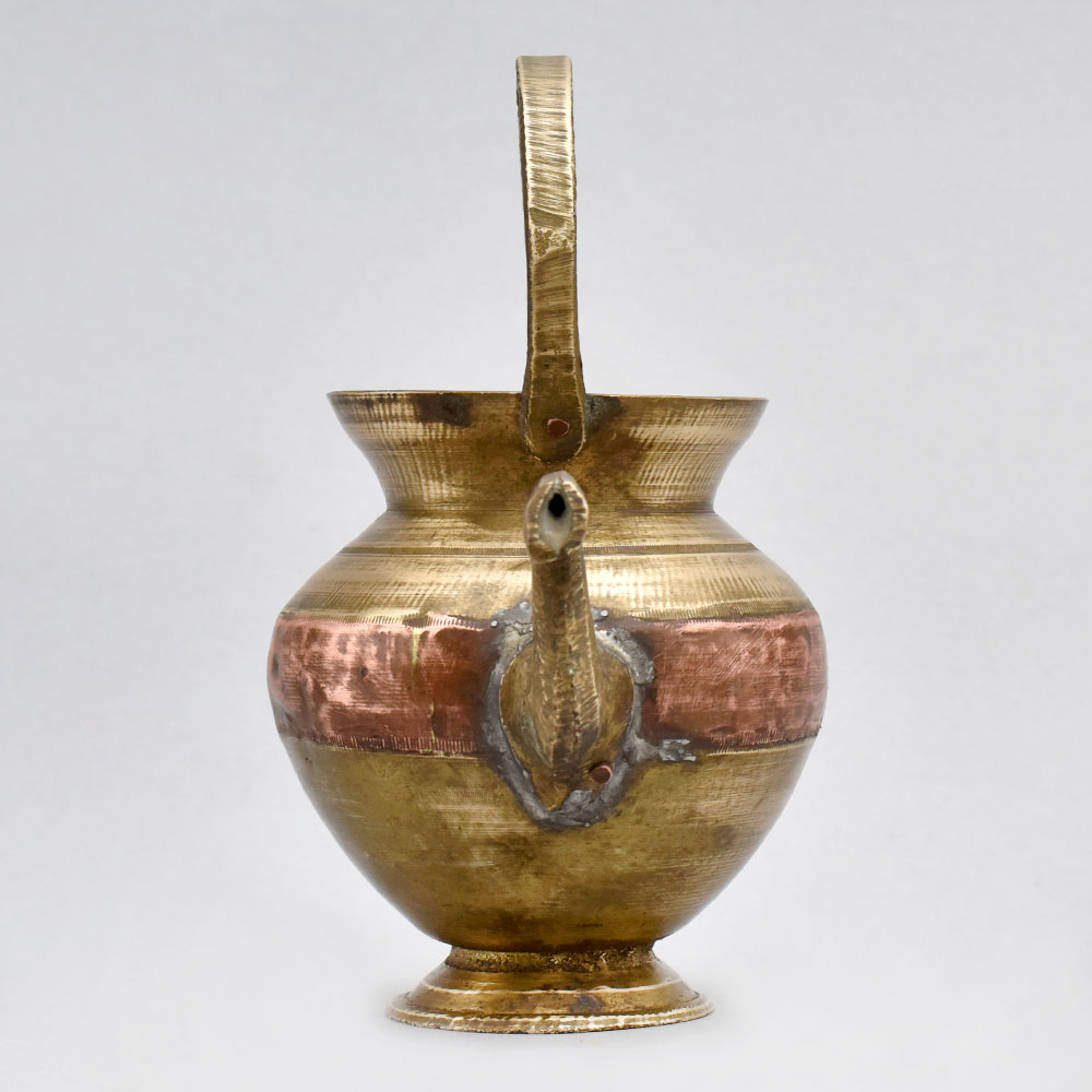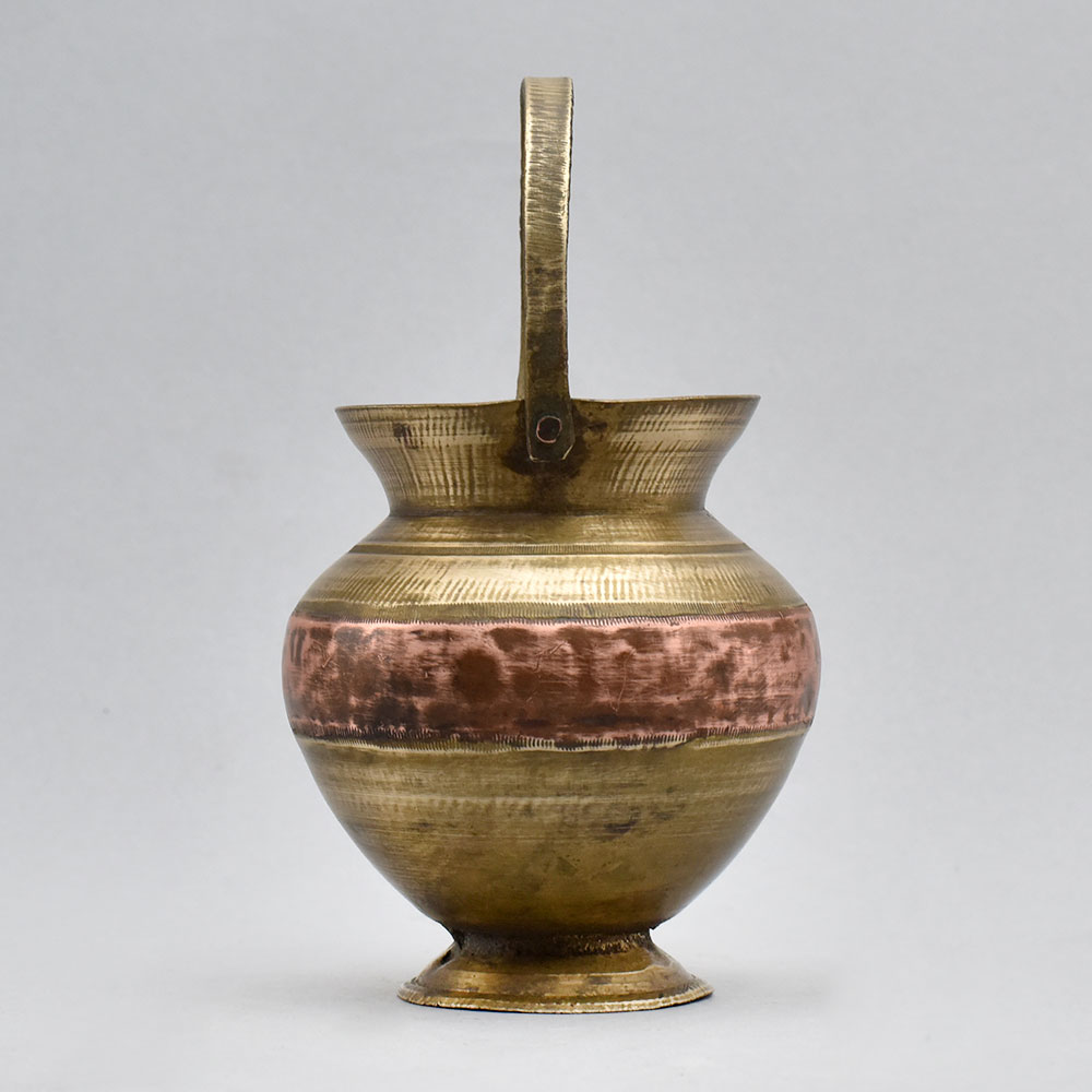 Elevate your home with this captivating Himalayan art piece - a small brass pot with a stunning copper inlay. Vintage, antique brass construction with intricate copper detailing Sturdy brass handle for easy carrying Broad base provides excellent stability Durable and aesthetically pleasing This exquisite pot was traditionally crafted in India to carry holy water, but its timeless beauty makes it a versatile decor piece. Display it proudly in your home or give it as a thoughtful gift that celebrates time-honored artistry. The brass and copper materials ensure it's built to last, while the intricate design adds an elegant touch to any space. Embrace the rich cultural heritage of India and elevate your everyday with this stunning Himalayan art piece. This unique handcrafted piece is a testament to traditional artistry, blending functionality with beauty and making it a treasured collectible for years to come.