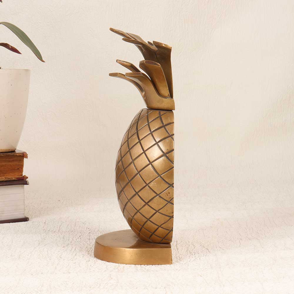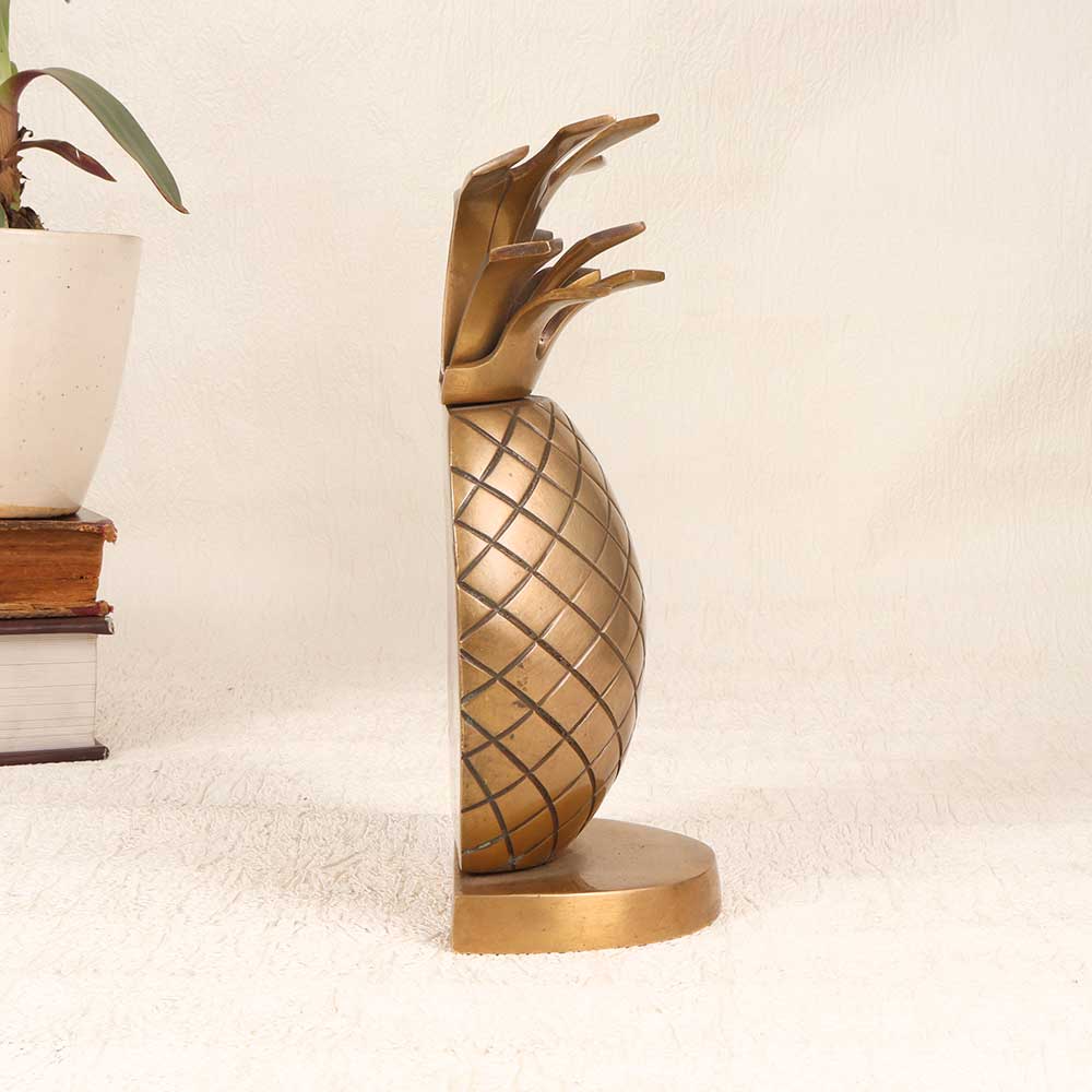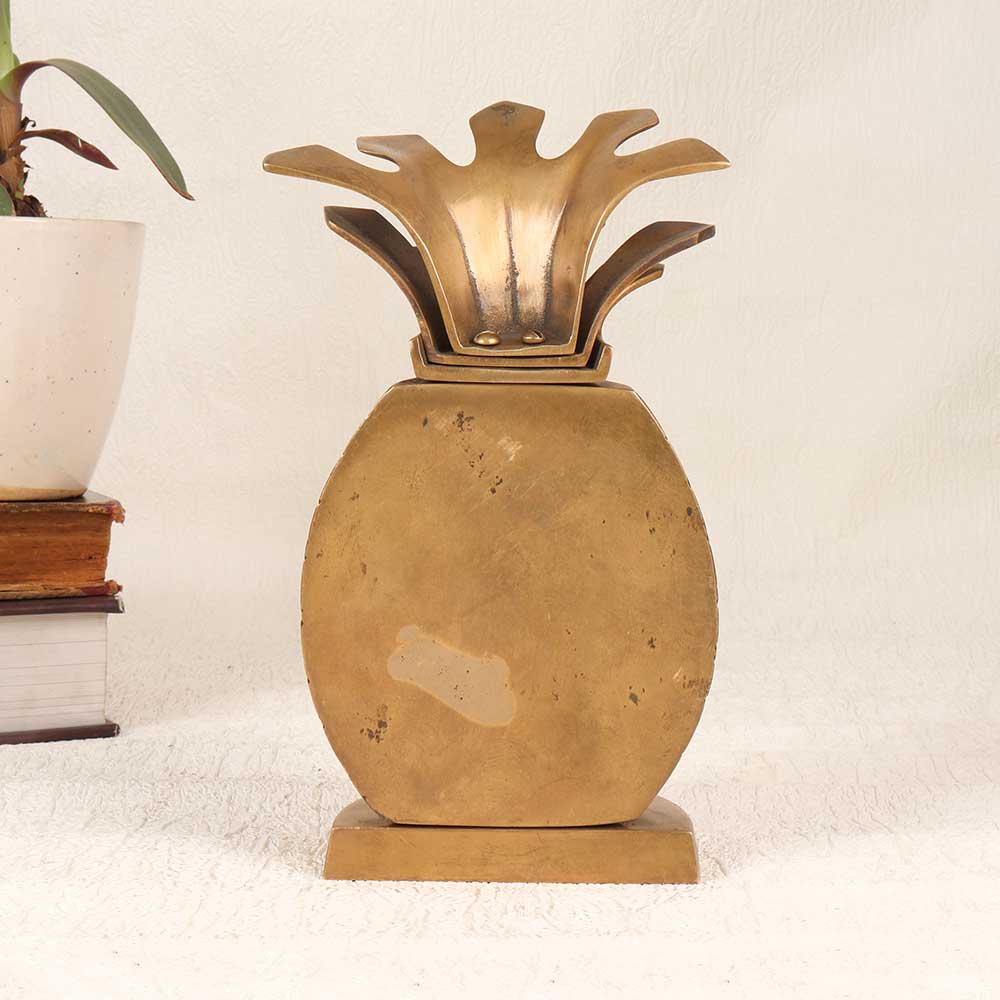 With its sculpted pineapple top and textured sides, this vintage brass half pineapple brings a refined charm to any space. The cool, smooth brass has an aged patina that evokes the elegance of a bygone era. Display this little pineapple on your console table or bookshelf to add a touch of nostalgia and tropical flair. The patina finish gives it a lovely vintage look, as if plucked from a grand English estate. Place it next to books, vases, and other accents to create an artful vignette. The compact size allows you to artfully arrange it without overpowering the space. For anyone seeking timeless, sophisticated decor with a hint of playfulness, this beautiful brass half pineapple is a must-have accent piece.
