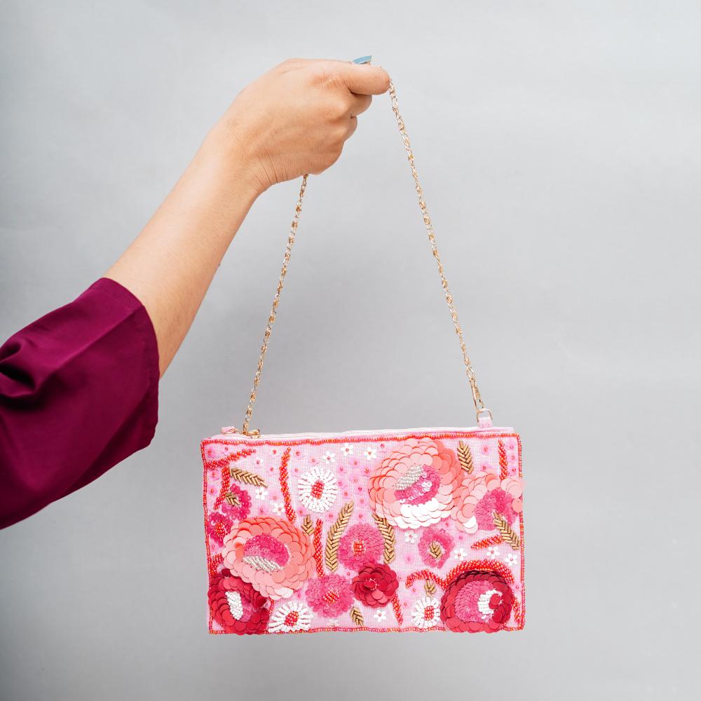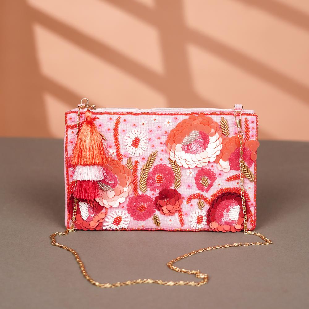 Infuse your wardrobe with boho charm with this vibrant cotton and beads handbag. The hand-embroidered floral motif explodes with color and creativity on a blush-pink backdrop, making each bag a unique expression of artisanal flair. A playful tassel dangles on one side, adding movement and character to this already lively accessory. Lightweight yet sturdy, this bag can complement both casual and semi-formal outfits, making it a versatile staple in your collection.