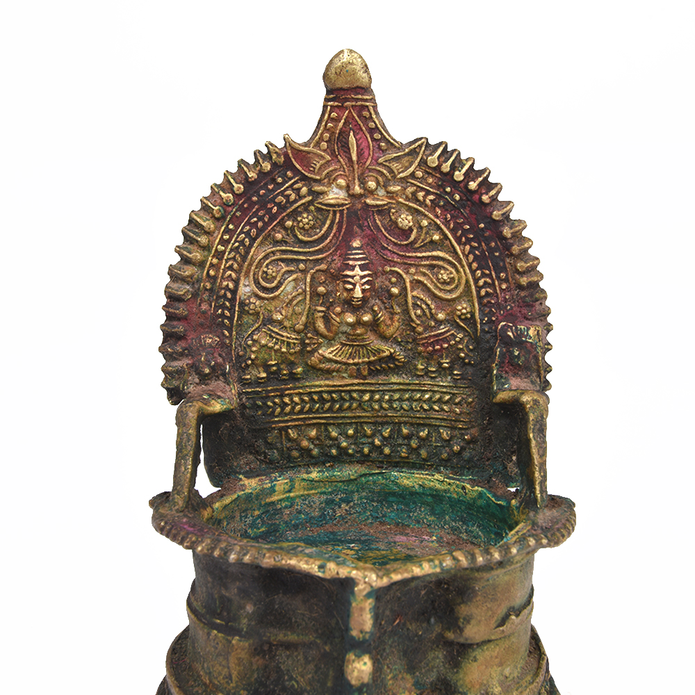 Solid Brass Lakshmi Villakku with a Singe Wick. It is Made by Lost Wax Process. Adds Spiritual Flavor to Your Decor. Vegetable Oil, Mustard Oil or Desi Ghee can be Use to Light the Lamp with Cotton Wicks.