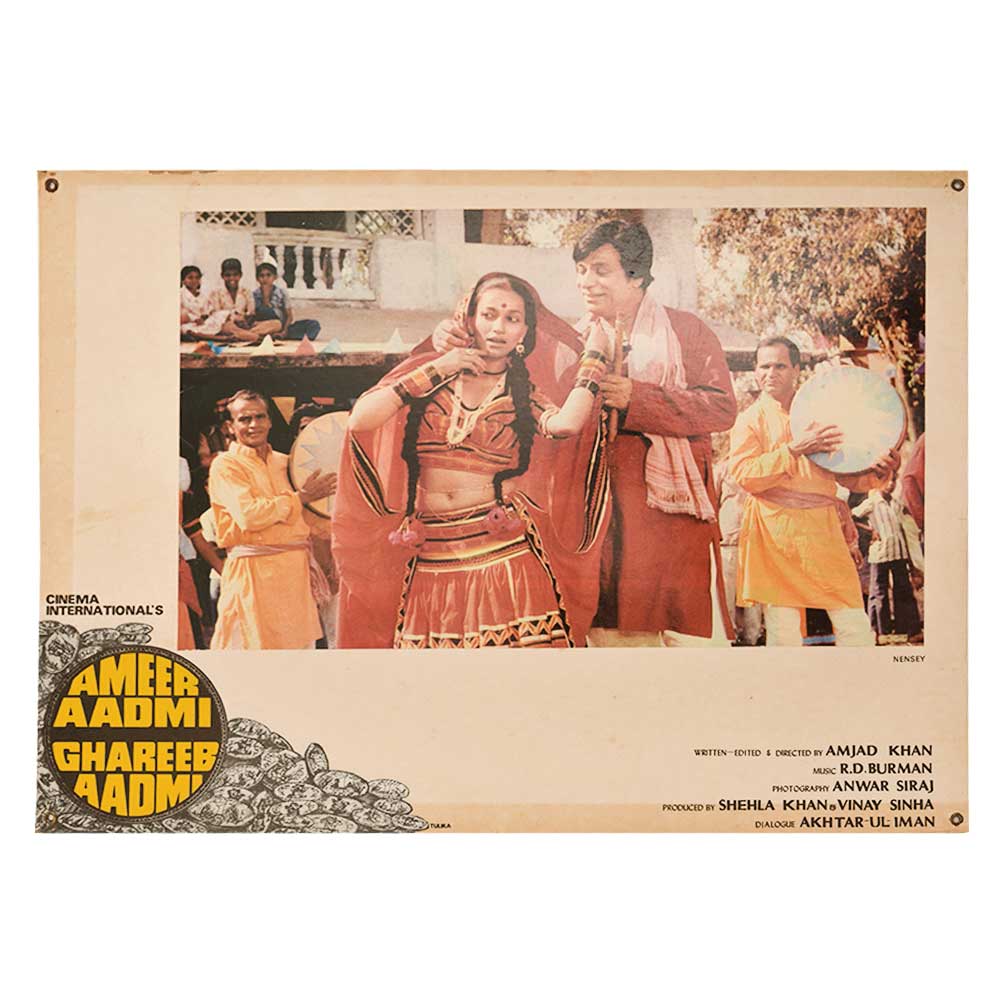 This is an old poster from the movie Ameer Aadmi Ghareeb Aadmi whcih was released in 1930 starring Shatrughan Sinha and Zeenat Aman. This poster is handmade and was released at the time of release of the movie . The poster shows a character artists singing a song for his beloved and the backdrop is of a village.