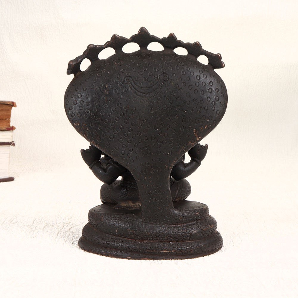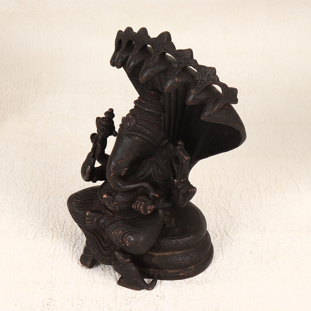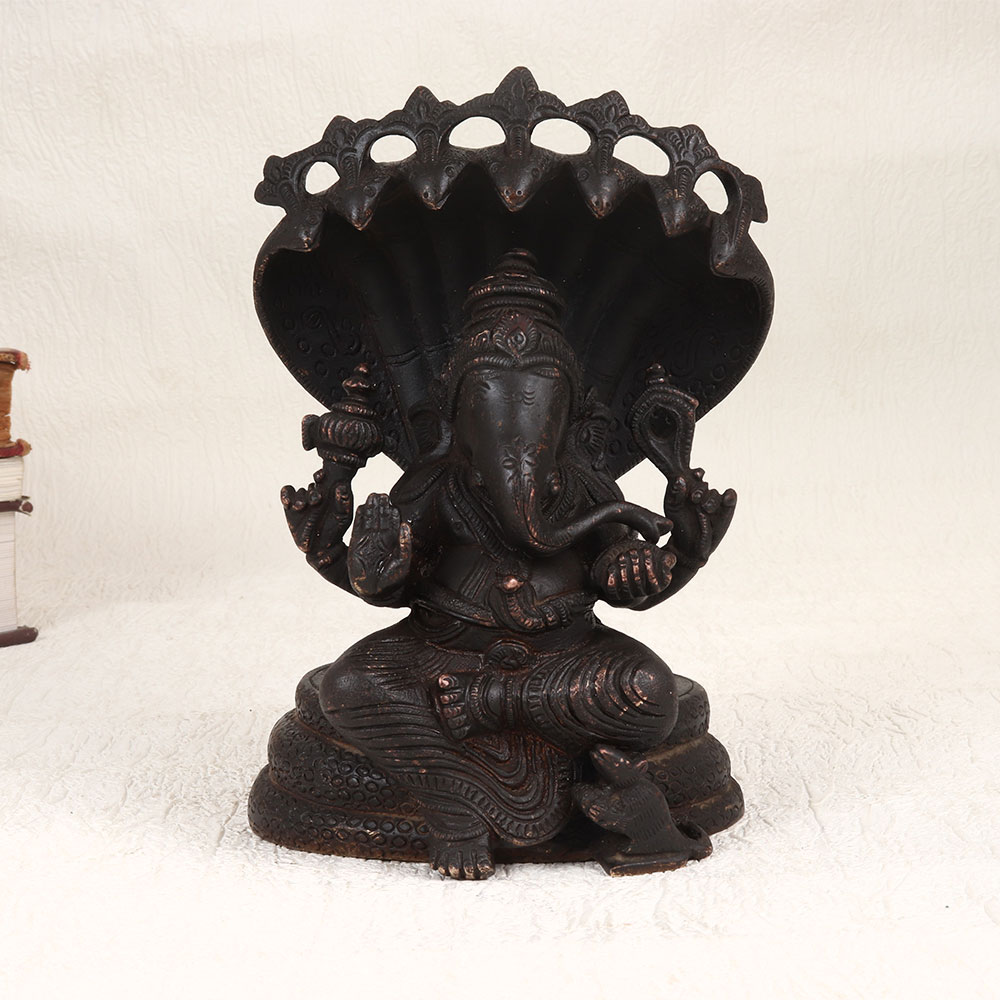 Immerse your space in divine elegance with our exquisite vintage brass statue of Lord Ganesha seated gracefully under the protective canopy of Sheshnag. Handcrafted by skilled Indian artisans in the time-honoured tradition of South Indian Art, this masterpiece exudes timeless charm with its dark finish. Crafted from high-quality brass, each detail is meticulously shaped, showcasing the artisan's dedication to perfection. This captivating Lord Ganesha statue is versatile, adding a touch of spirituality to your home, office, restaurant, hotel, or cafe prayer room. Its intricate design and vintage allure make it an ideal decorative piece, seamlessly blending tradition with sophistication. Elevate your collection of vintage treasures or present it as a thoughtful gift to your family, friends or relatives on special, festive, or auspicious occasions. Embrace the artistry, spirituality, and cultural richness embodied in this handmade creation, a testament to the enduring beauty of Indian craftsmanship.